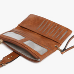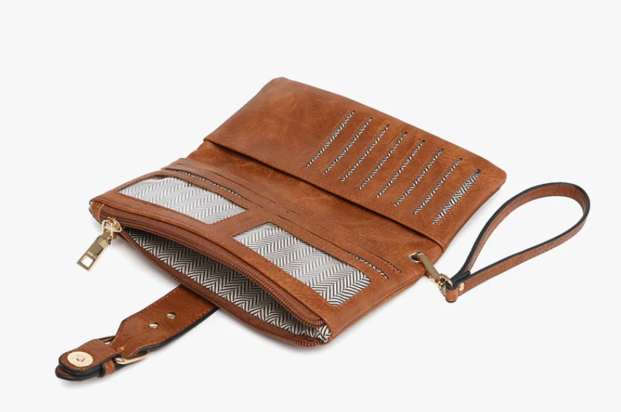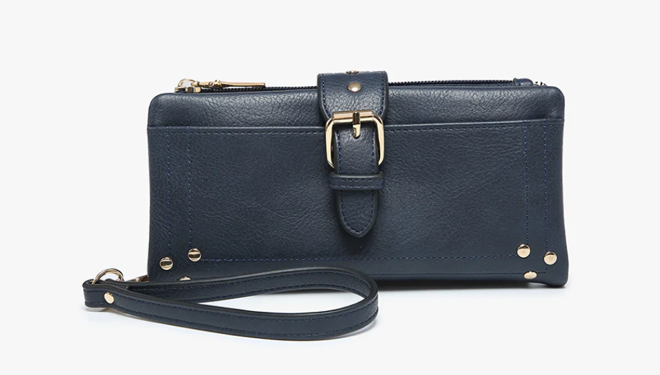 Introducing Cadence, our latest addition to the collection of popular wallets! Cadence stands out with its zip top closure and buckle front snap closure, offering versatility and security in one chic design. With the convenient wristlet strap, you can carry Cadence as a clutch, or remove it and use it as a wallet within your favorite Jen & Co. handbag. Equipped with two ID slots and ample space for all your cards, Cadence ensures efficient organization wherever you go. Crafted from vegan leather, it's a stylish and sustainable accessory choice.
