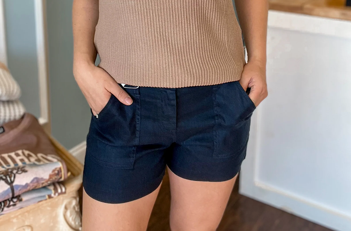 Treat yourself to stretch linen Tencel™ lyocell in Navy Blue! Cleo is a clean flat front relaxed short you will want to pack for that upcoming vacation.