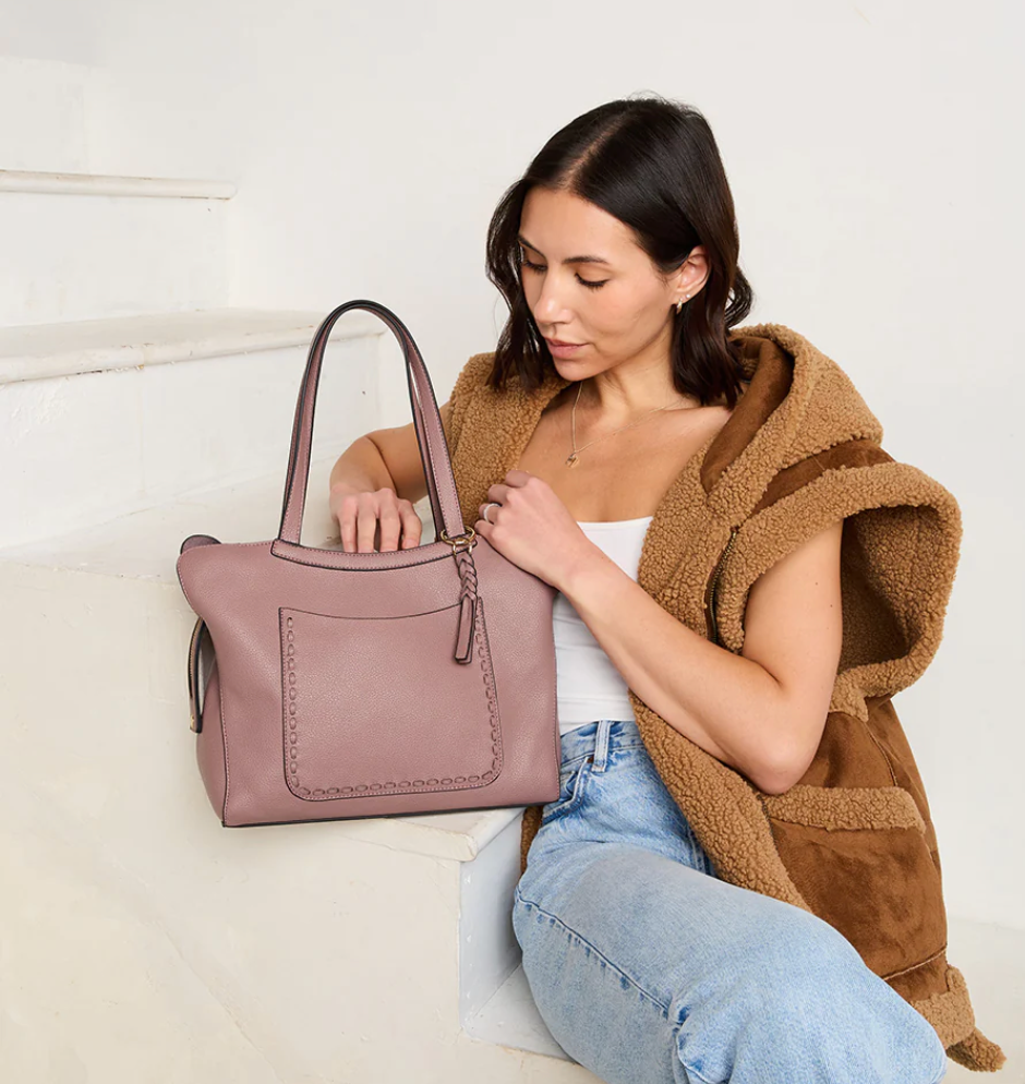 The Hunter Pocket-Front Distressed Tote offers a rugged yet stylish look with its distressed fabric construction. Featuring a secure top zip closure and a unique whipstitch front slip pocket, this tote combines fashion and functionality. A removable braided bag charm adds a touch of personalization, while an inner pouch provides additional storage for your essentials.