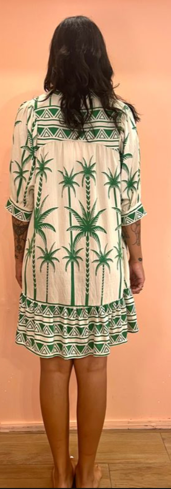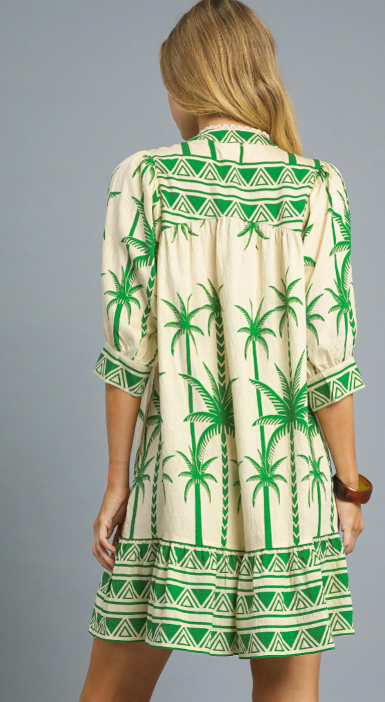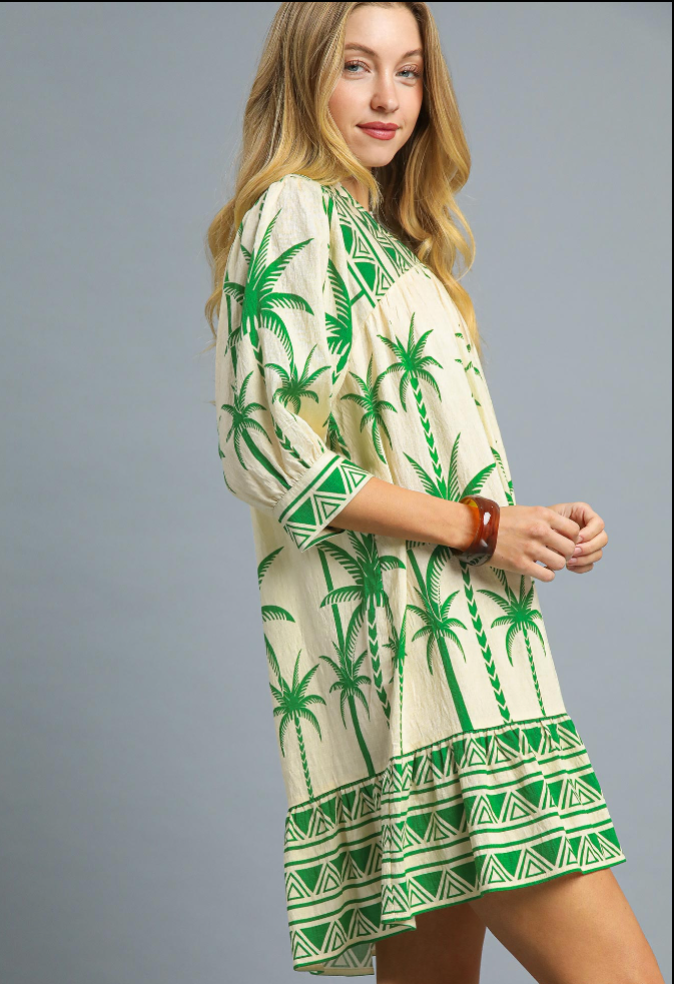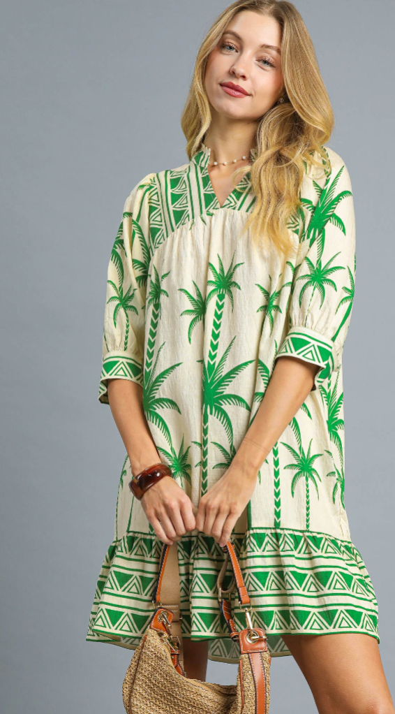 Bring a splash of tropical fun to your wardrobe with the Palm Tree Border Print Dress in green and tan. Its 3/4 sleeves and breezy fit make it perfect for sunny days and spontaneous adventures. Lightweight and lively, this dress turns every outing into a playful escape.