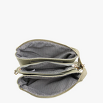 - Versatile crossbody/clutch with two major compartments and a middle zipper pocket for organization.