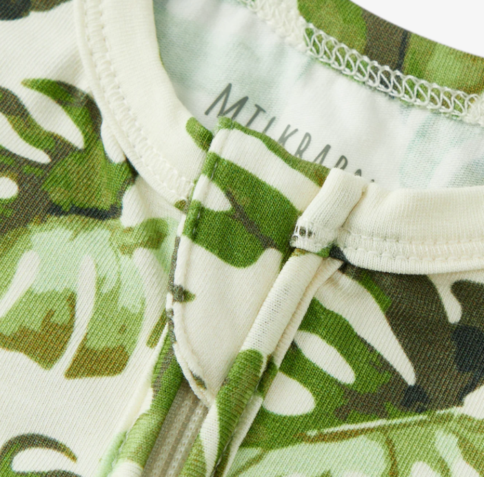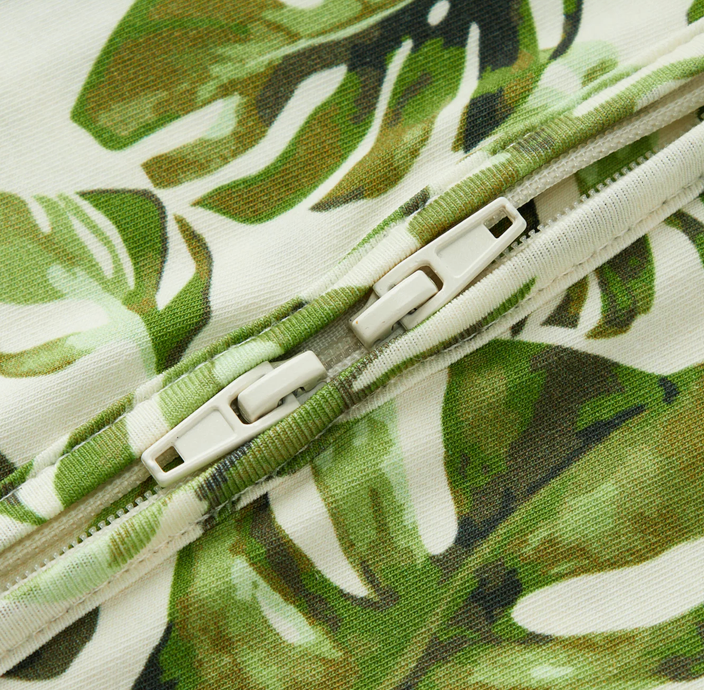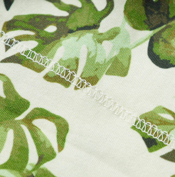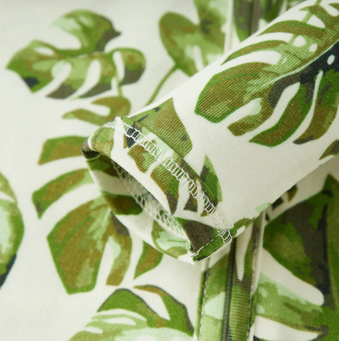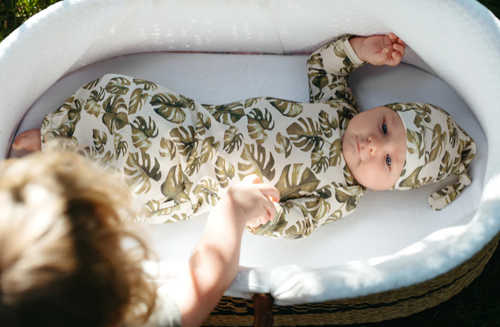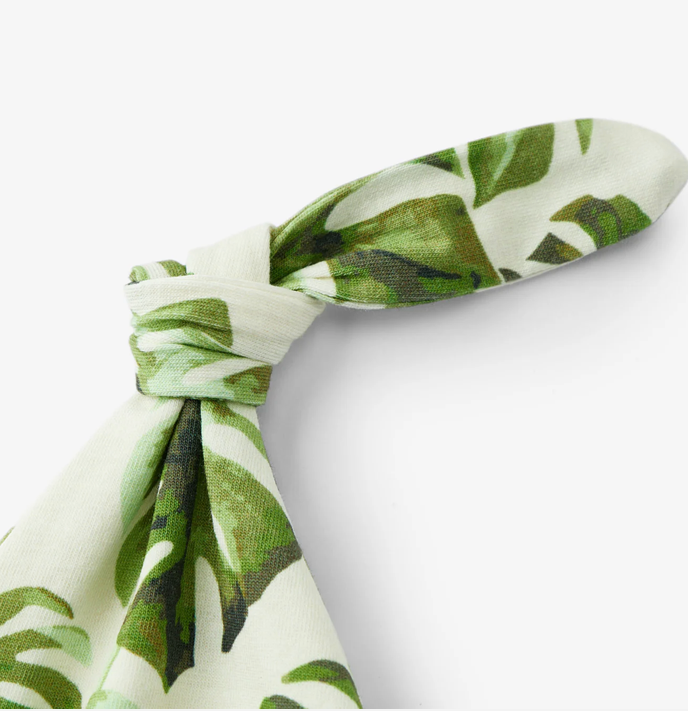 From that first emotional trip home to the initial months of bonding in the rocking chair, we highlight the beauty of your bundle of joy in our cozy, newborn Cotton Stretch Gown & Hat Set in the Island Leaf print. The coordinating knotted hat adds warmth, the fold-over hand covers provide added protection, and the soft elastic bottom and envelope neckline allow for ease of changing. Pair our Gown & Hat set with our coordinating Swaddle blanket or Burp Cloths for that perfect ensemble.