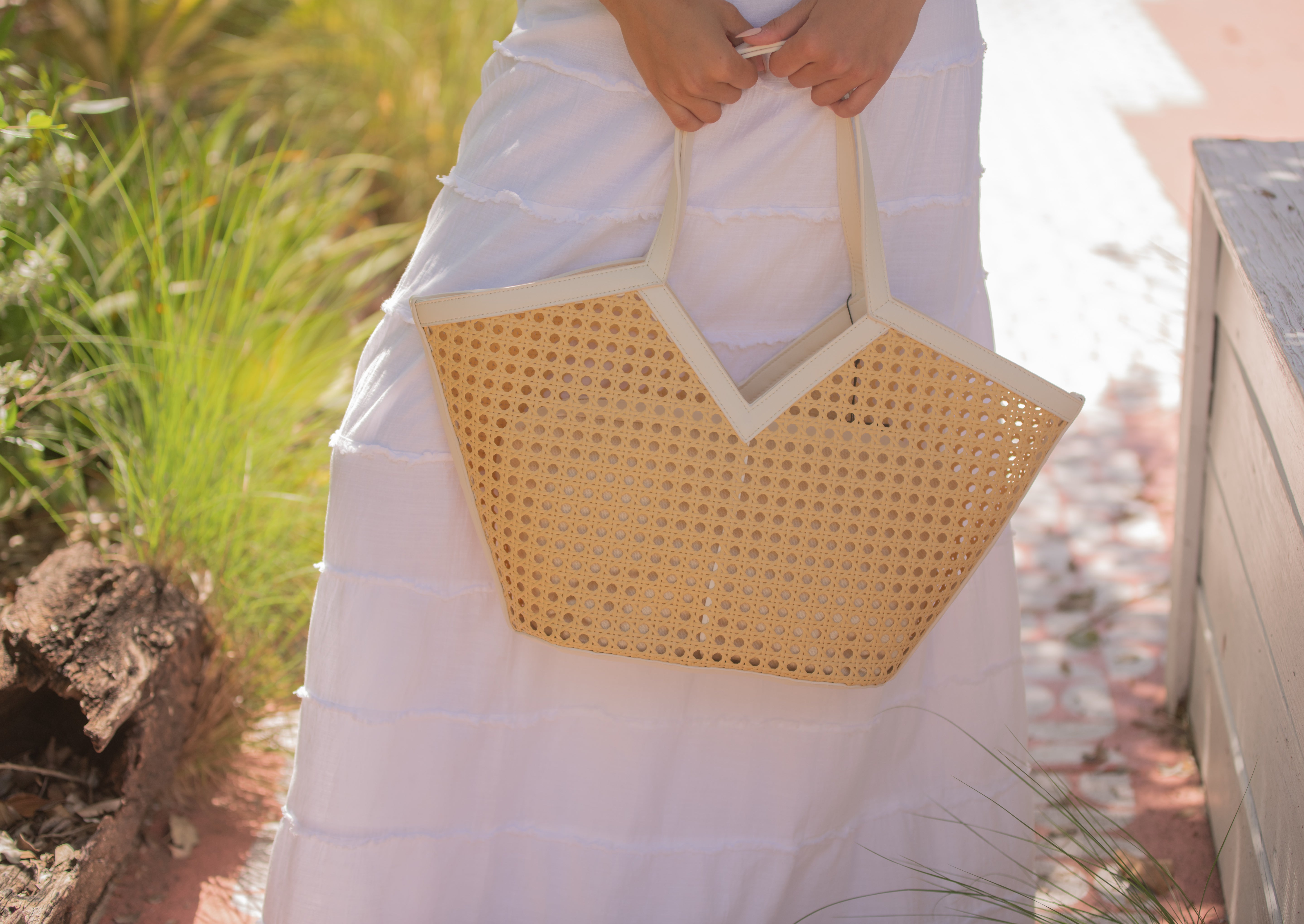 Straw Tote With White Faux Leather V Trim - Straw / White