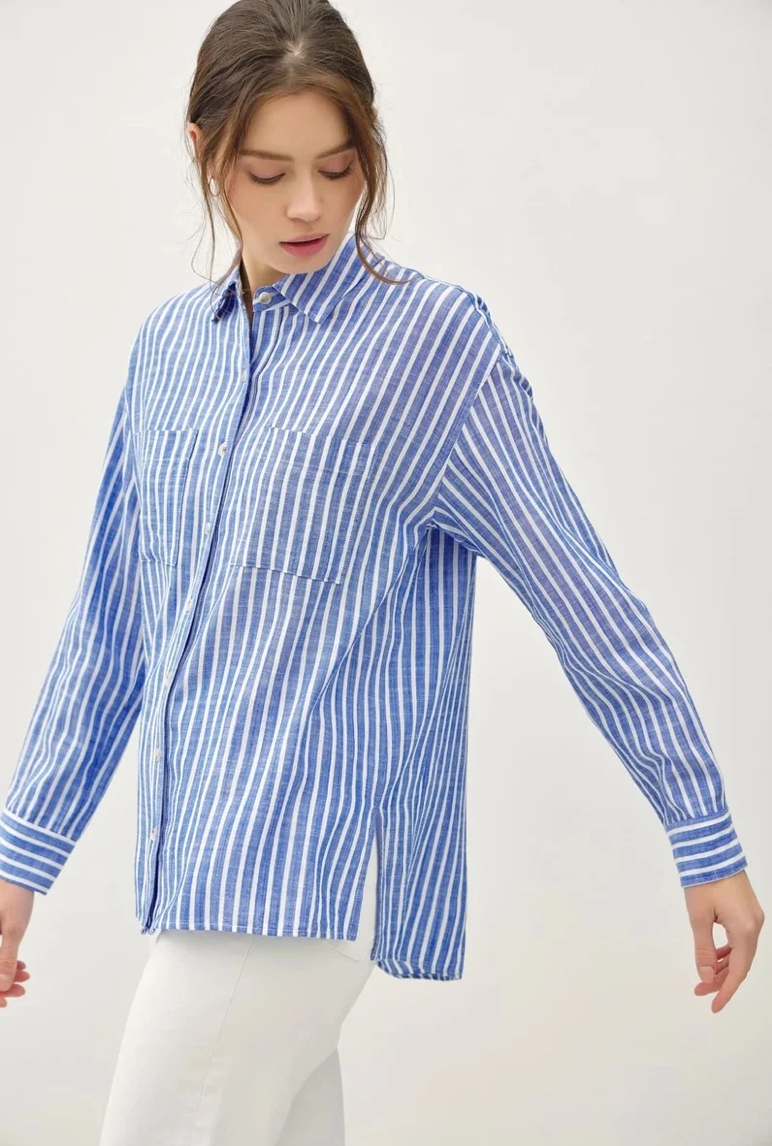 Elevate your casual wardrobe with the Striped Button Up Shirt - Be Cool - 19500. Featuring a timeless striped pattern, this shirt is designed with a classic button-up front and a collared neckline for a polished yet relaxed look. The front chest pockets add functionality and subtle detail, while the long sleeves and side slits ensure ease of movement and comfort. Falling below the hip, this shirt offers a flattering fit and versatile styling options. Ideal for spring and summer, it pairs effortlessly with your favorite jeans or shorts for an easygoing, everyday outfit.