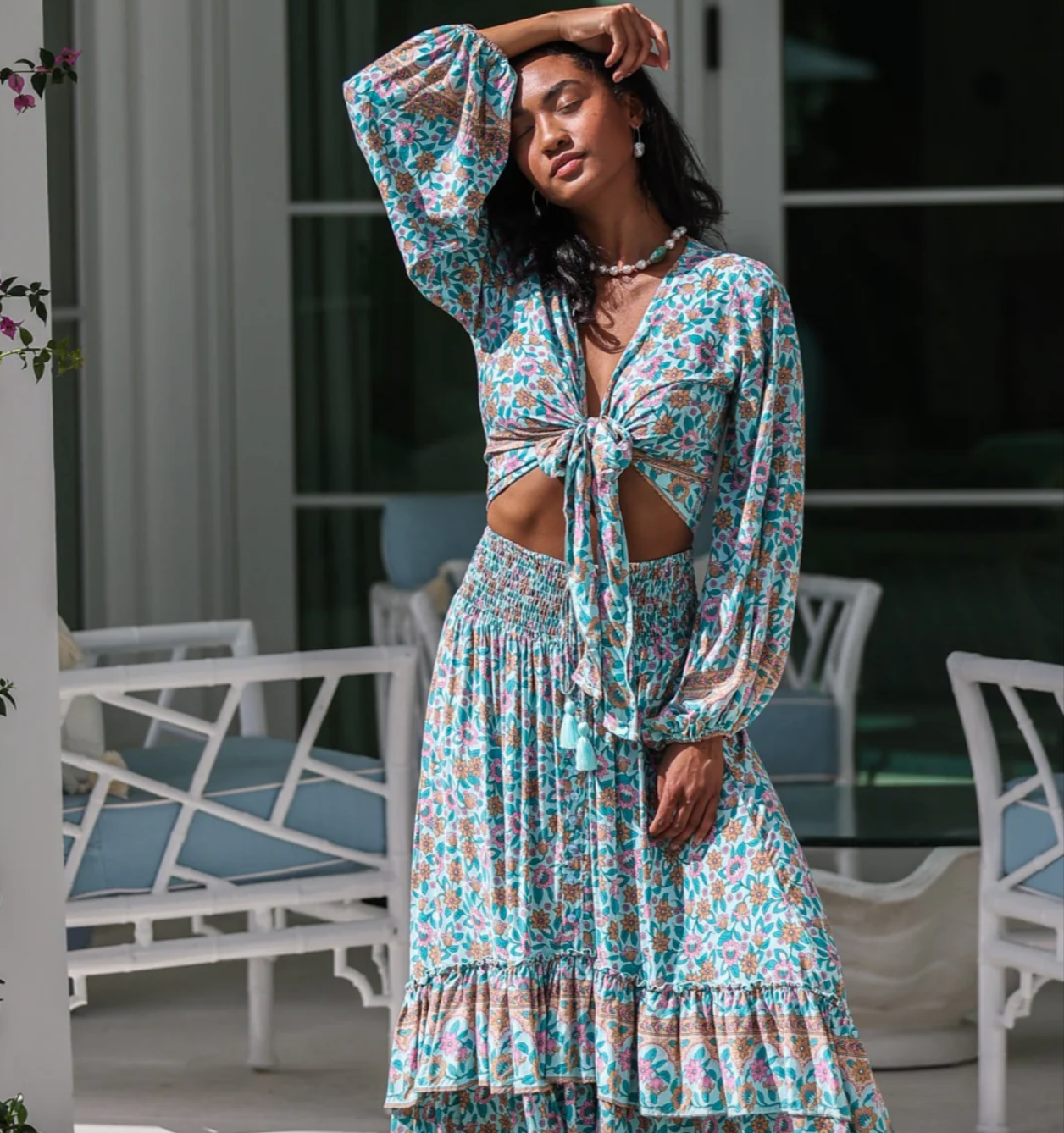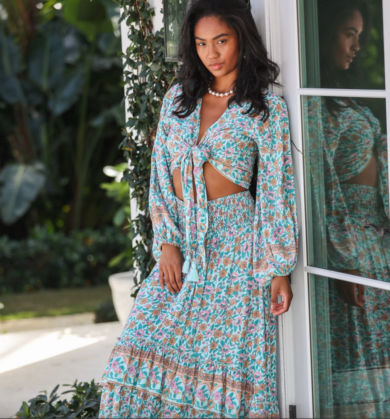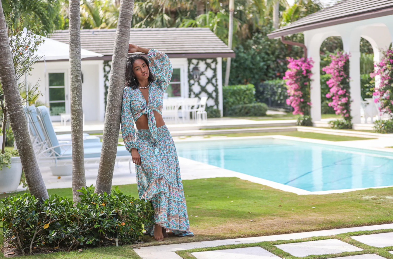 Lifestyle model is 5'7" wearing and studio model is 5'10" both wearing size S/M. Shown with our Ciao Skirt in Seafoam.