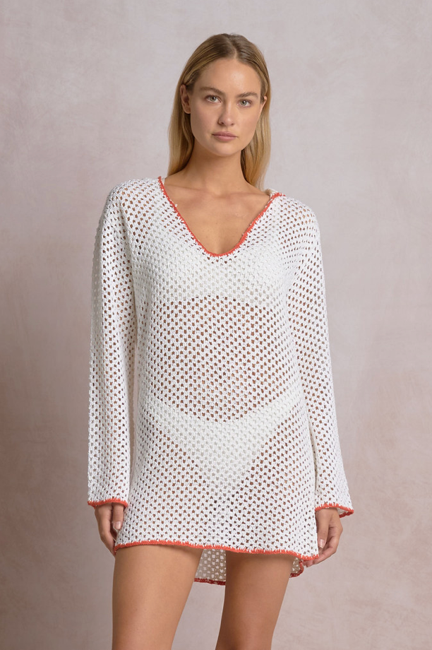 Crochet Long Sleeve Hoodie Dress With Orange Trim by Elan - White / Orange