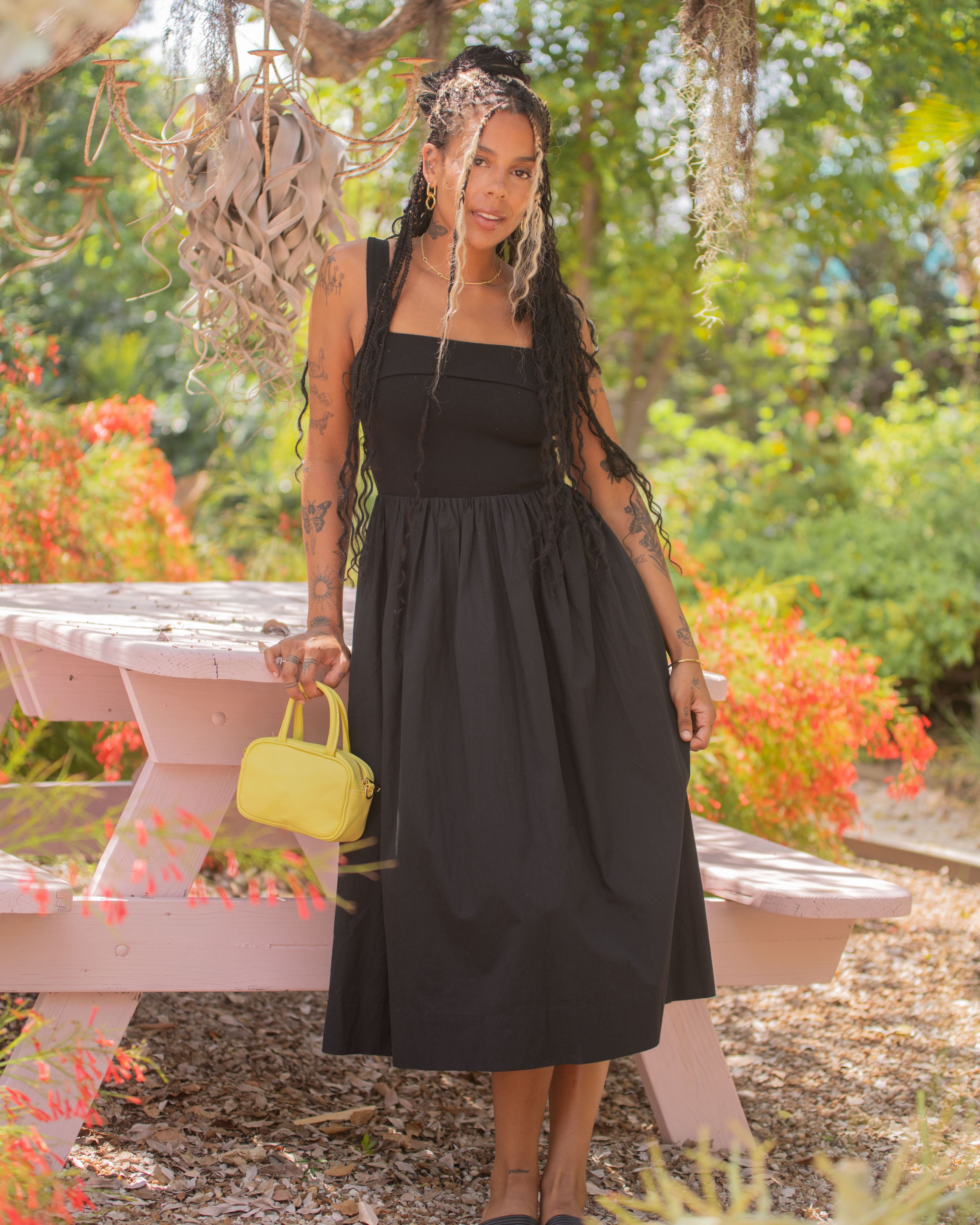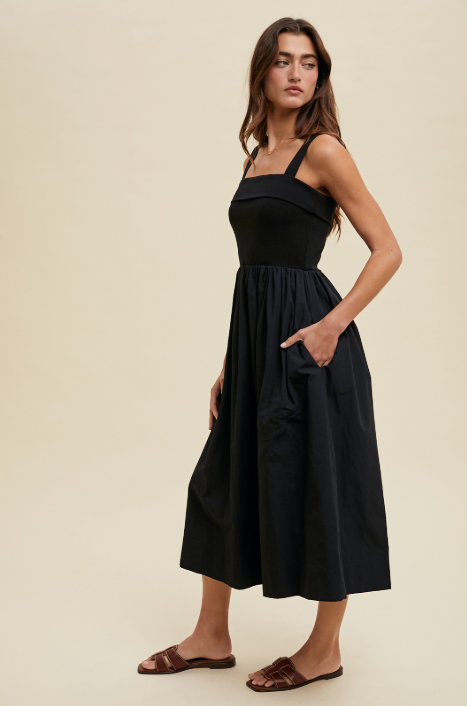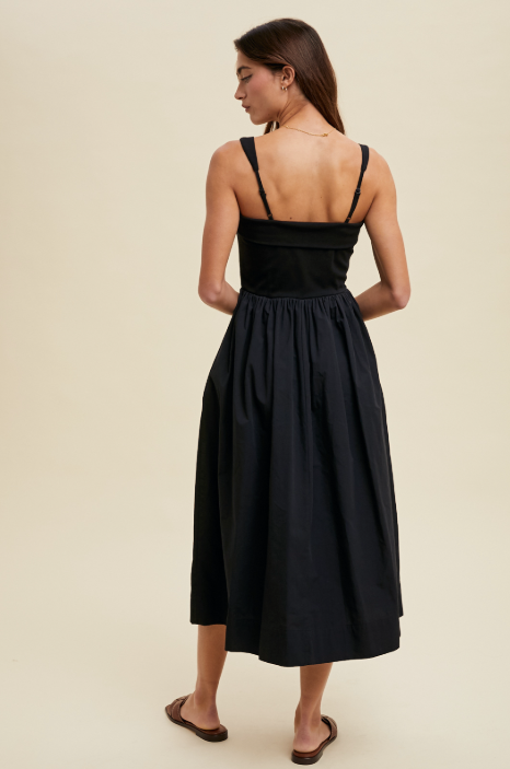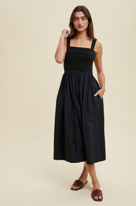 Black Midi Tank Dress w/ Stretchy Top & Flowy Skirt by Wishlist - Black