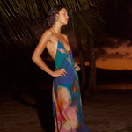 Features: Halter-style V-neckline, low back detail, bias-cut silhouette, printed design