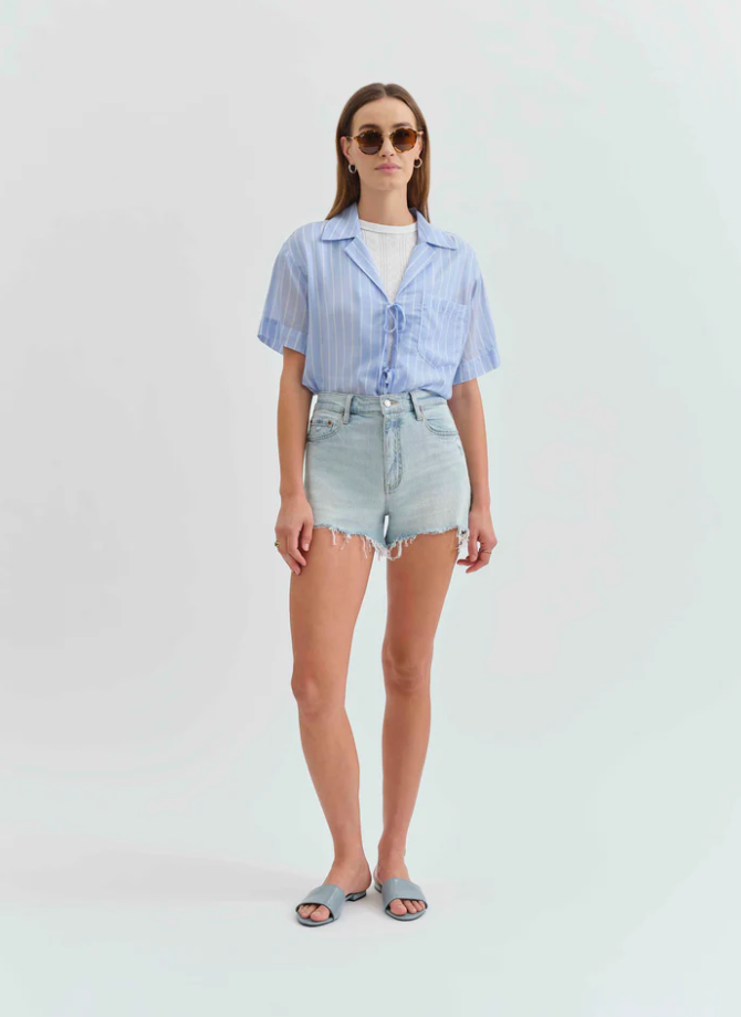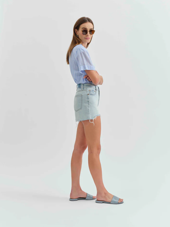 A light wash jean short in the most iconic fit of all time - the cutoff. With a light wash and distressed hem, it is like a true vintage short. Constructed in our "Tough Love" denim, it's mostly rigid but yields to your body in all the right ways.