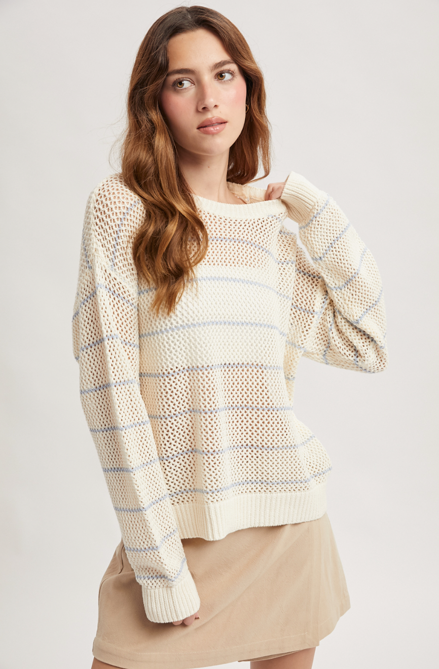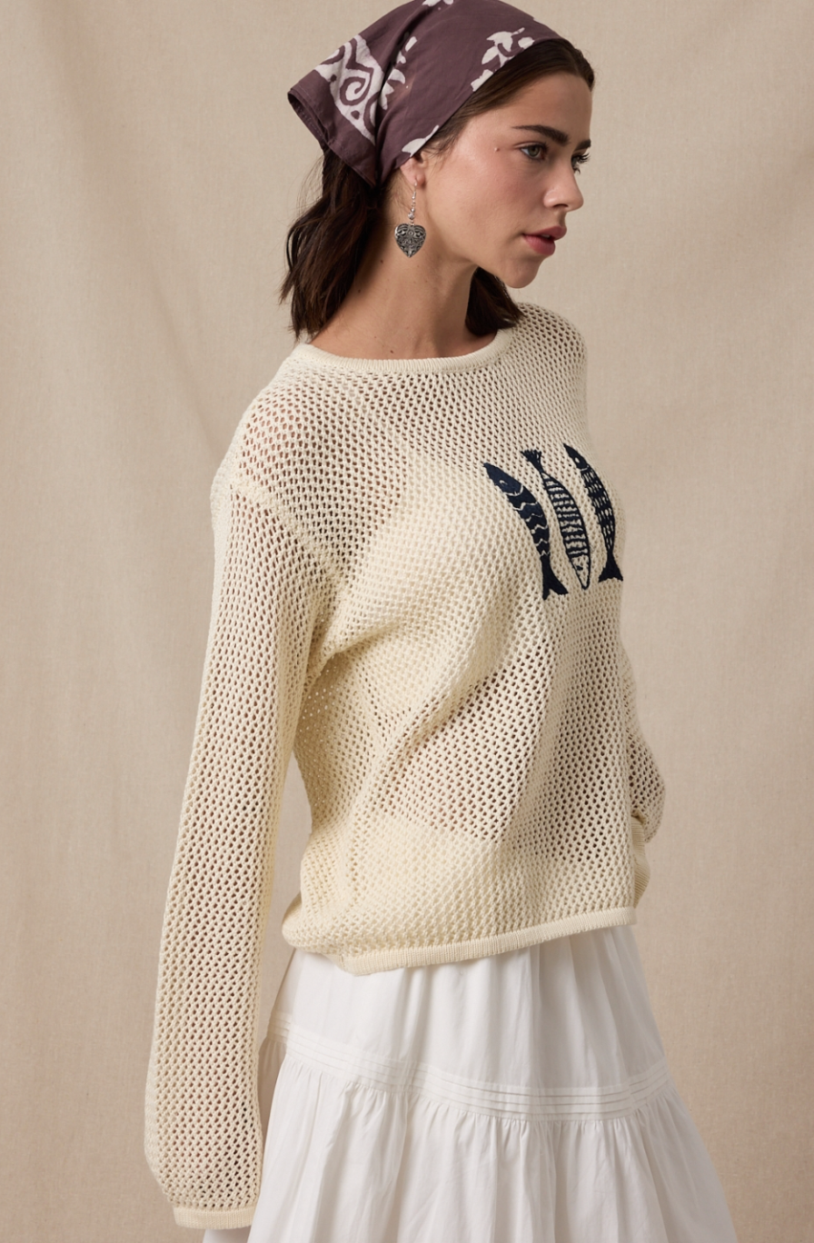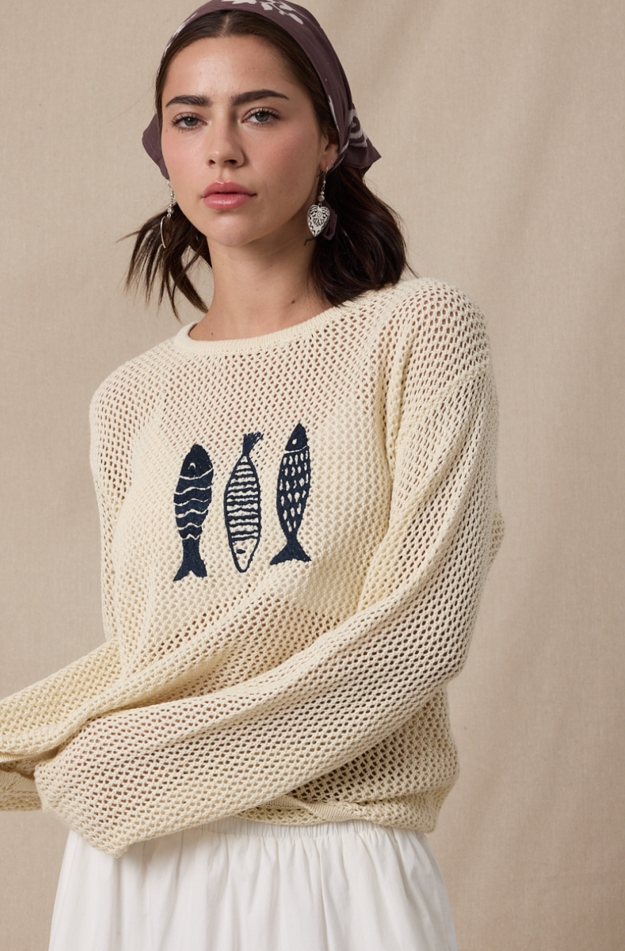 Fish Trio Embroidered Open Knit Sweater - Natural / Navy