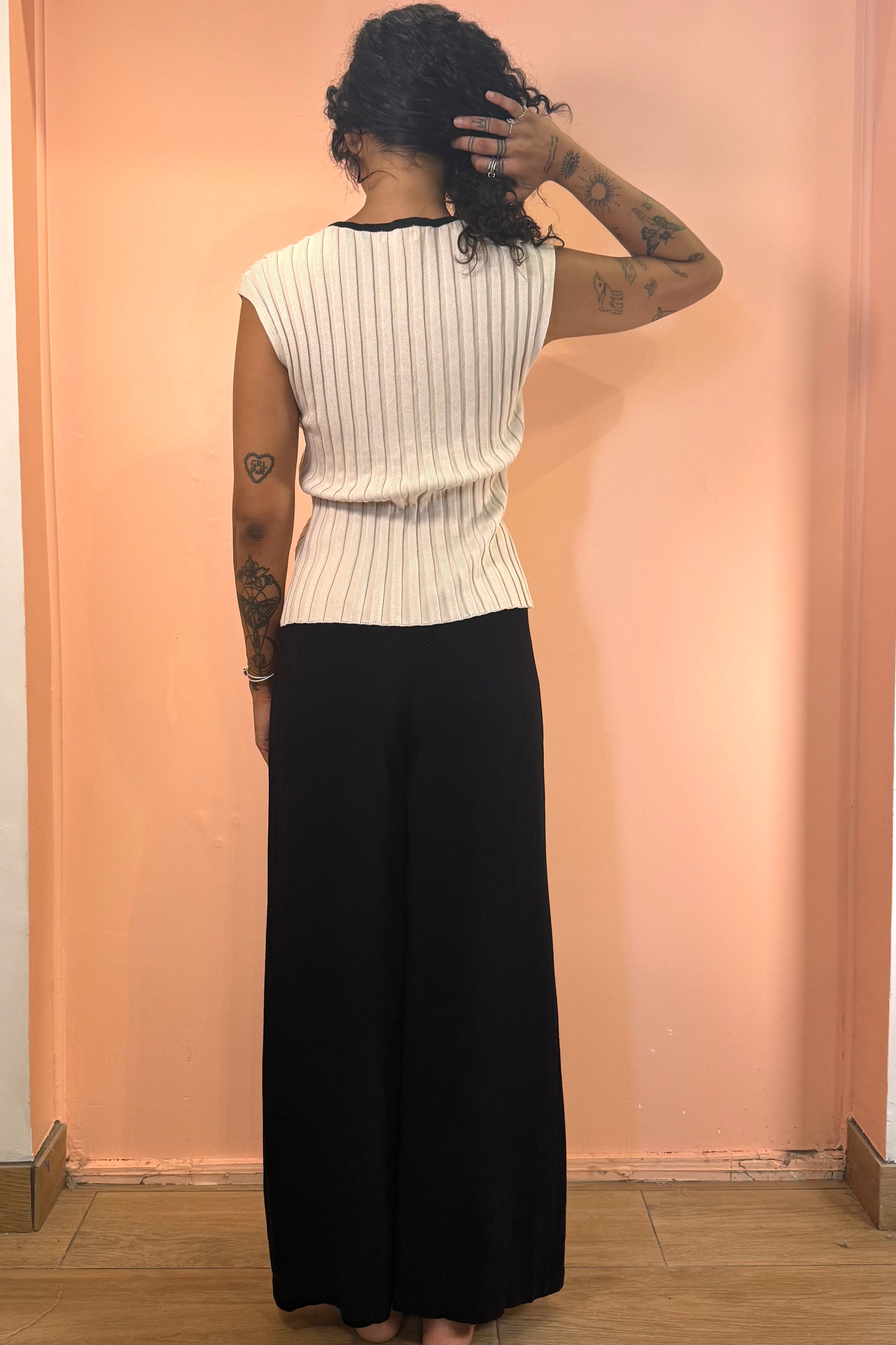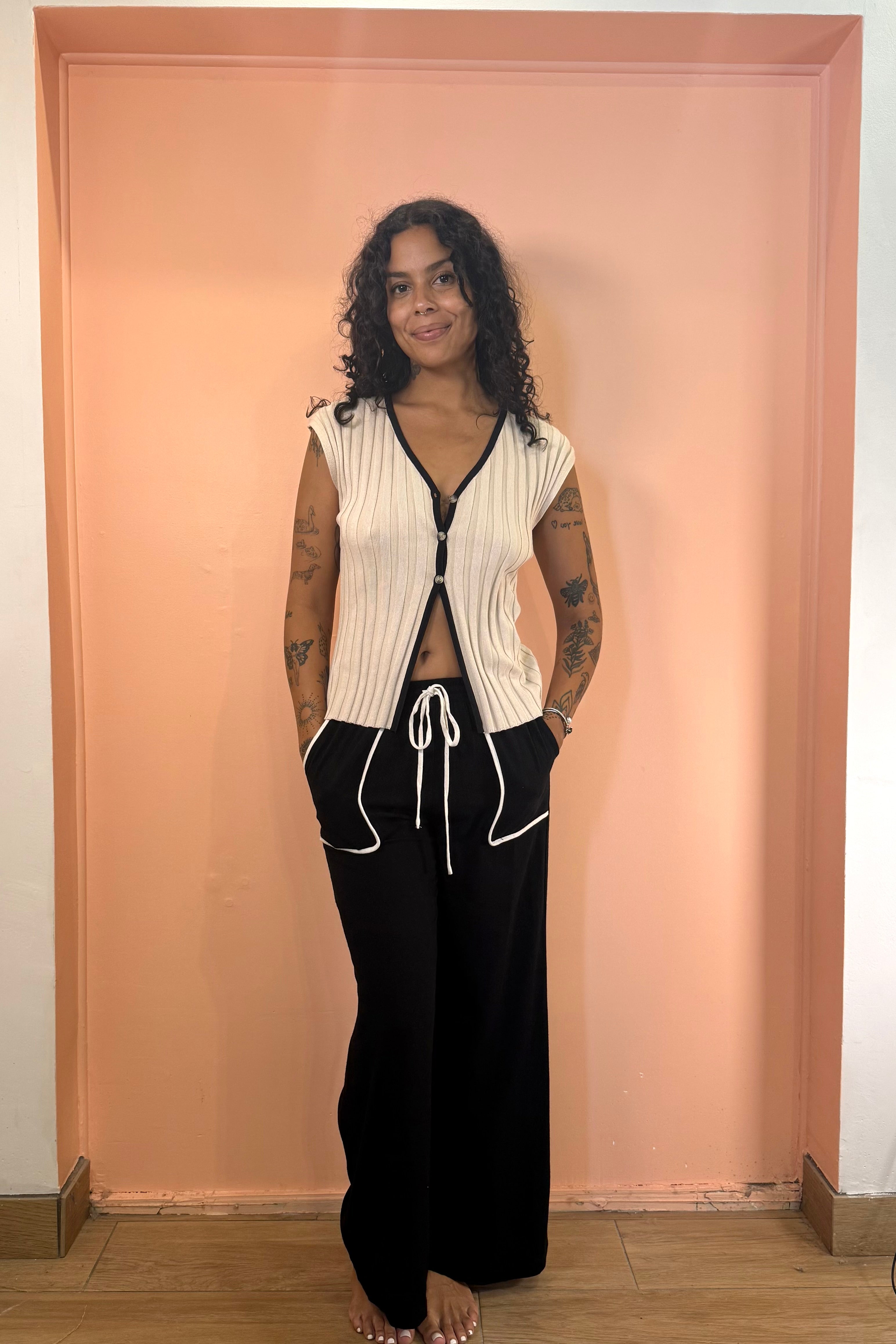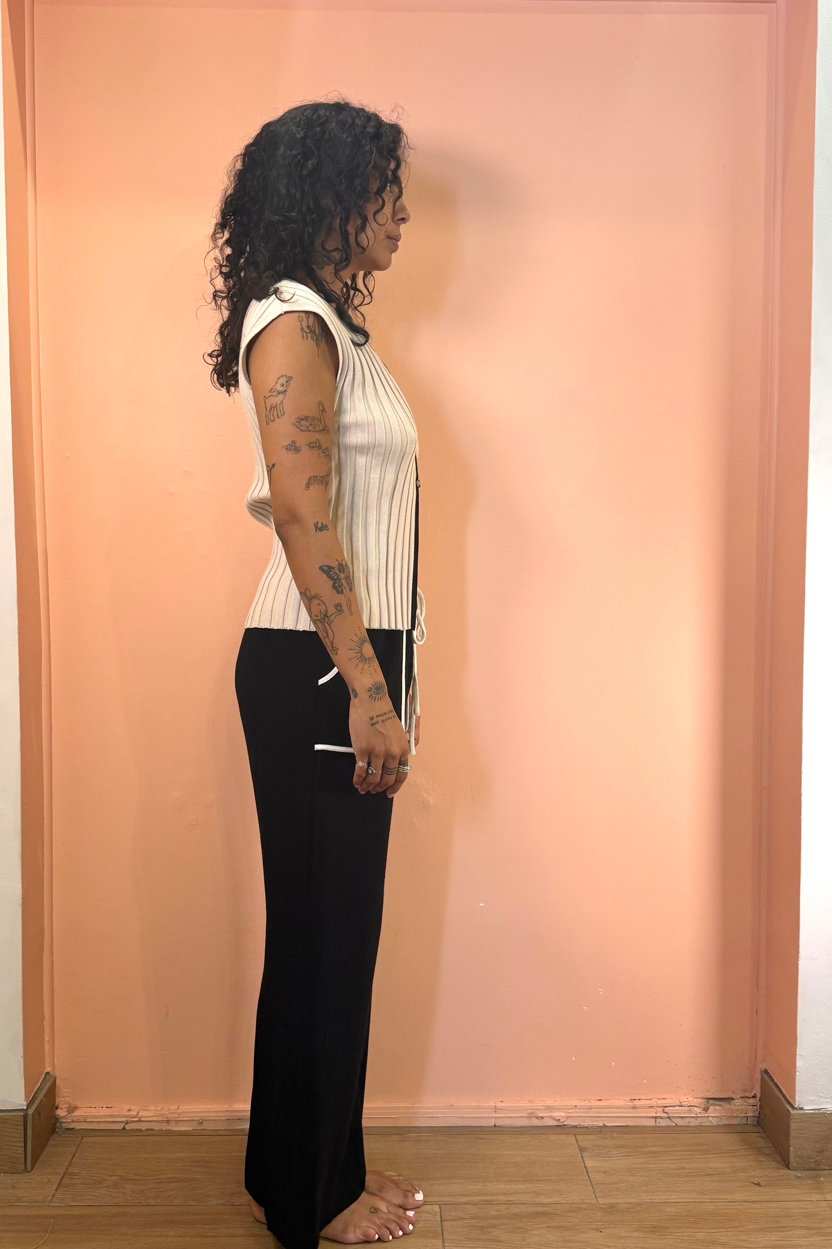 Contrast Trim Ribbed Knit Tank Top With Open Front Slit - Taupe / Black