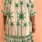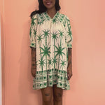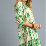 Palm Tree Border Print Dress With 3/4 Sleeve - Green & Tan