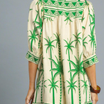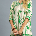 Bring a splash of tropical fun to your wardrobe with the Palm Tree Border Print Dress in green and tan. Its 3/4 sleeves and breezy fit make it perfect for sunny days and spontaneous adventures. Lightweight and lively, this dress turns every outing into a playful escape.