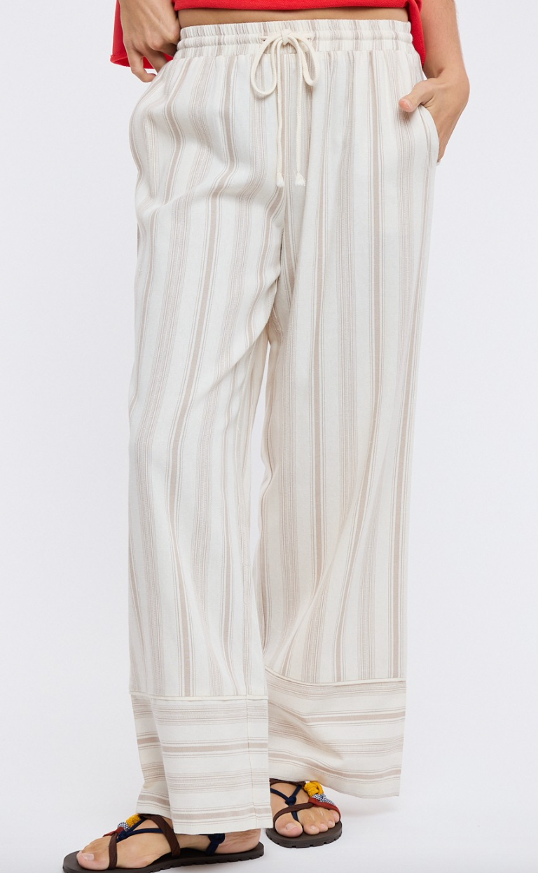 Striped Drawstring Wide Leg Pants WIth Hem Detail by Wishlist - Mocha / Cream