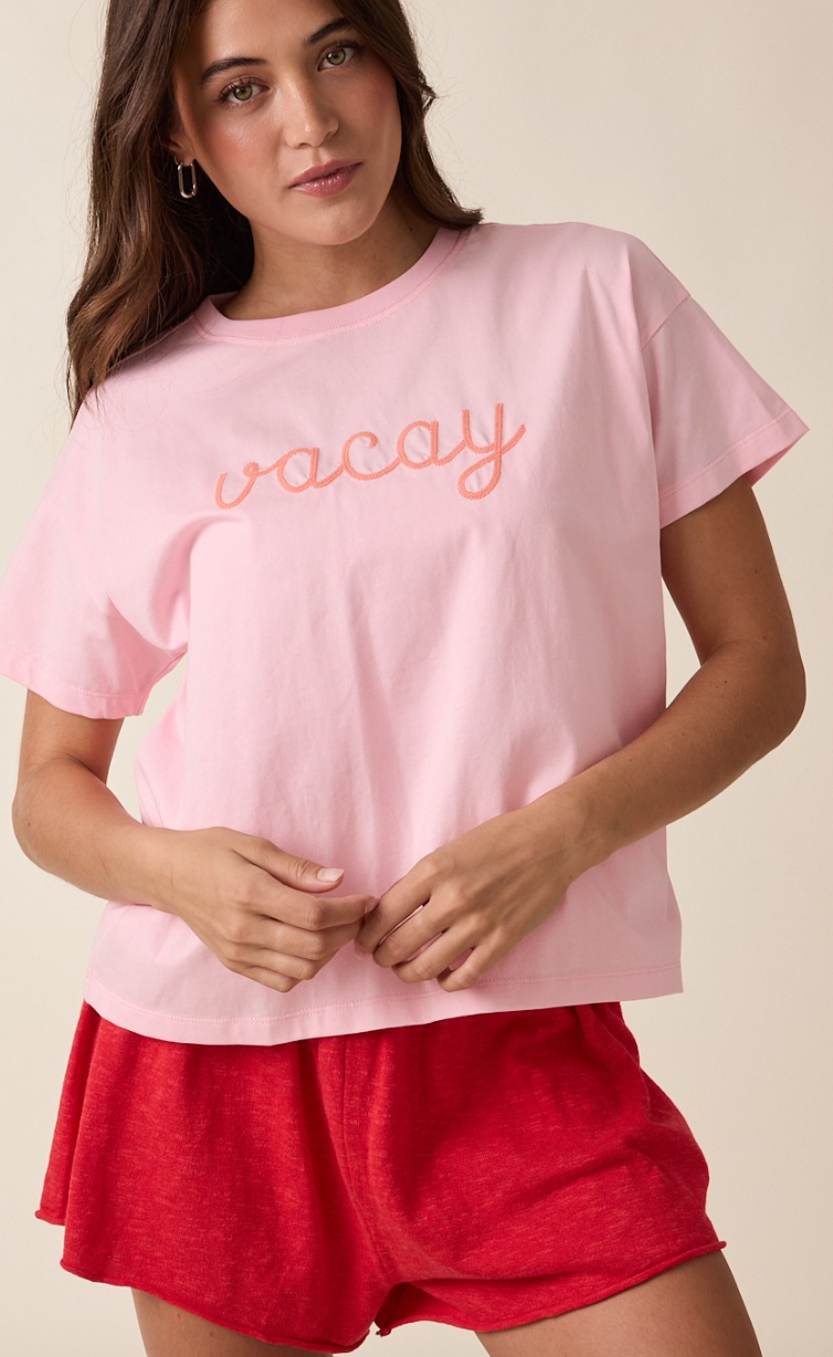 Vacay Embroidered Short Sleeve Tee - Pink / Orange
