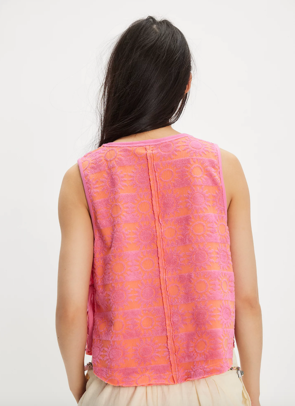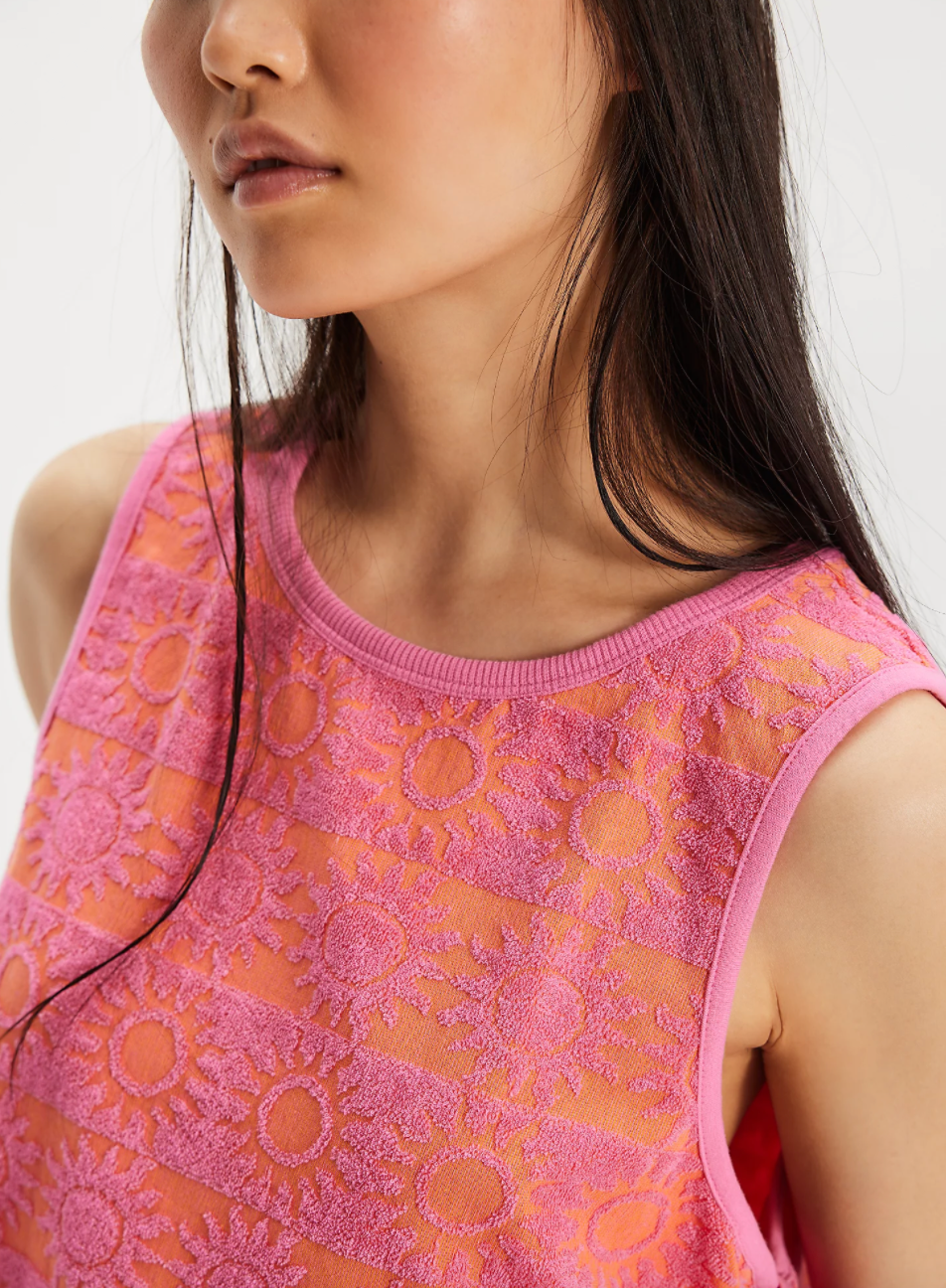 Keep it beachy with this essential tank, featured in a classic terry fabrication with open sides, tie details, and sun motifs all over.