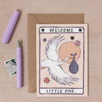 Say hello to a new little human with this gorgeous gender neutral new baby card featuring unique hand-painted artwork of a soaring stork carrying a bundle to their new home. The soft, pastel colours surrounded by the “Welcome Little One” caption in a unique font create a soothing yet joyful design that’s perfect for any new parents.