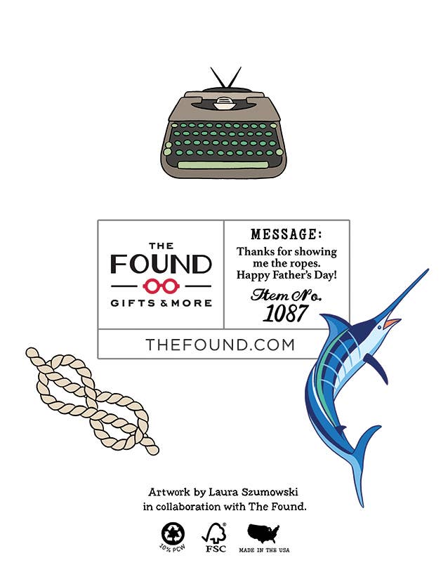 • A2 folded card, 5.5" x 4.25" folded • Ecru euroflap envelope • Locally printed on recycled paper from an FSC-certified mill with soy-based inks Message: Thanks for showing me the ropes. Happy Father's Day!