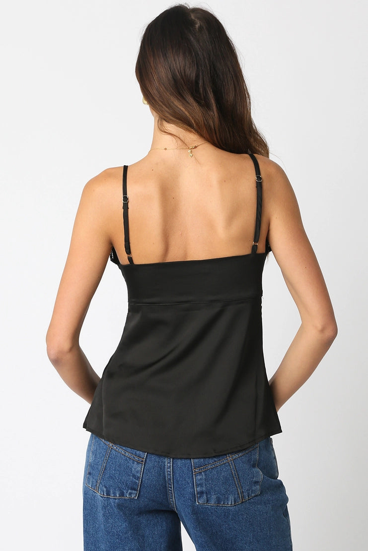 Our Black Satin Cami features an adjustable strap and a Slit detail in the front.