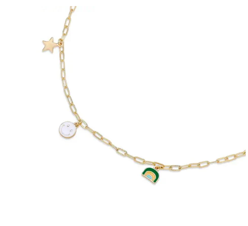 Our most anticipated new arrival, the Enamel Treasures! Trendy and cute, these necklaces feature dangling miniature enamel-painted charms fit on a 14k gold-dipped paperclip chain. In six unique styles, there is truly something for everyone, at any age. Great as a statement piece or layered on top of other chains!Our most anticipated new arrival, the Enamel Treasures! Trendy and cute, these necklaces feature dangling miniature enamel-painted charms fit on a 14k gold-dipped paperclip chain. In six unique styles, there is truly something for everyone, at any age. Great as a statement piece or layered on top of other chains!