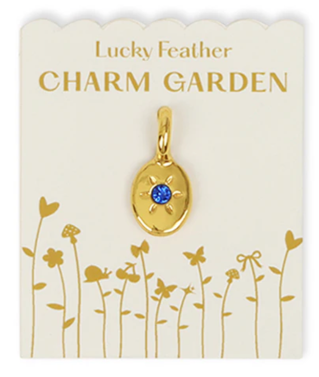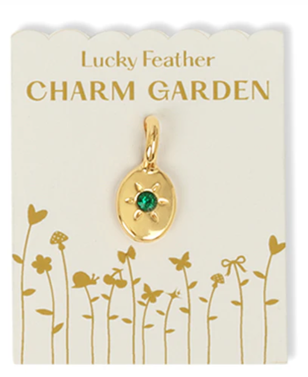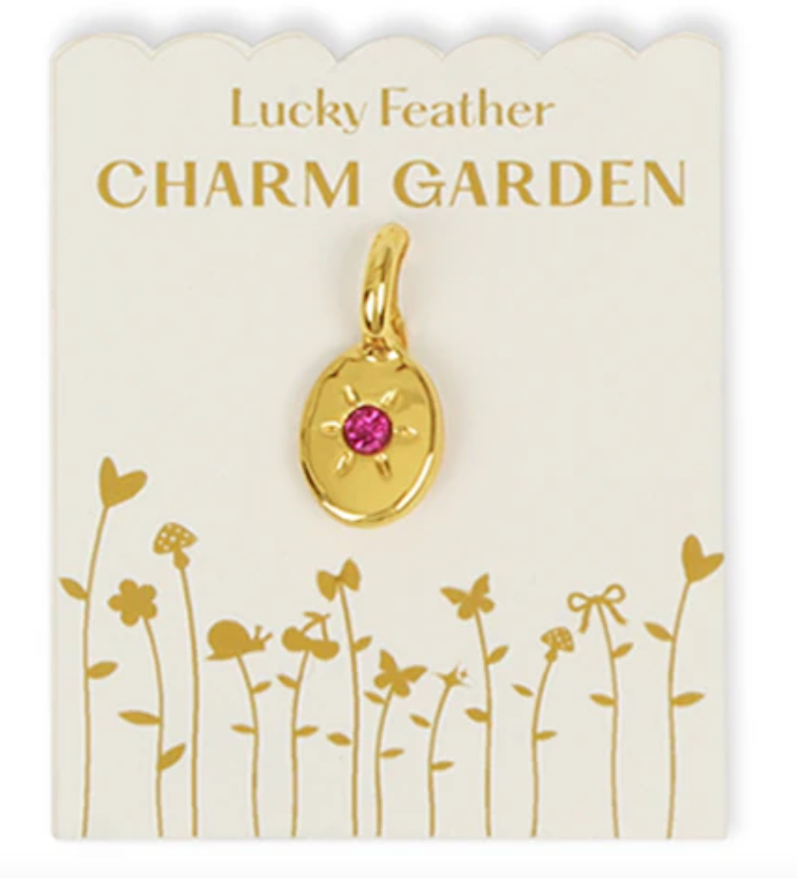 Personalize your charms with your birthstone.The Lucky Feather Charm Garden is a collection of charms, including shape charms, initial charms, and birthstone charms, that can be added to necklaces and bracelets to create personalized jewelry. The collection is known for its vintage-inspired designs and 14k gold or sterling silver plated materials. The charms are designed to be fun, personalized, and meaningful gifts.