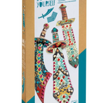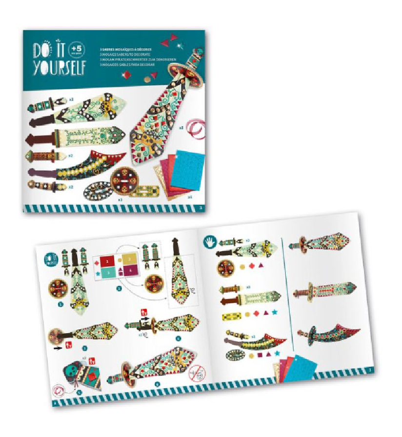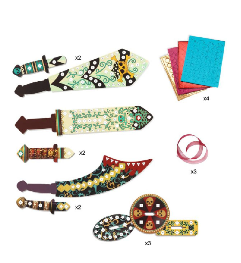 Contents: 3 thick cardboard swords, 4 sets of metallic mosaic foam stickers, 1 set of instructions.