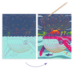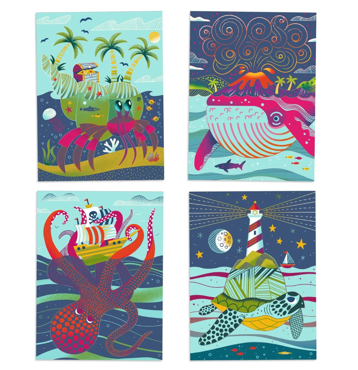 A pocket with 4 dual-color scratch cards that play with the concept of “before and after” and entice you to discover what’s really hiding under the surface. Reproduce the patterns designed by the artist by scratching the surface with the wooden stylus. Gradually, the illustrations are revealed as if by magic!
