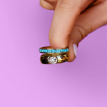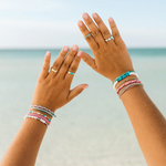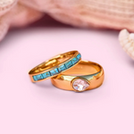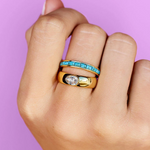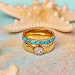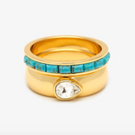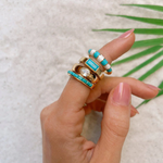 Spring Break approved ring stack: check! This two-piece set beautifully combines coastal-inspired blue and gold tones with a bezel-set glass center stone and genuine turquoise tile bead inlay.