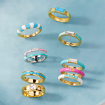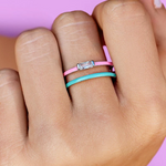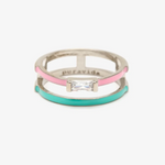 Vibrant contrast creates a unique stack dynamic in one single piece with the Leilani Layered Ring. This ring has two bands that meet at the back, both surrounded by glossy, pastel enamel. The top band features a Baguette clear glass stone in a bezel setting.