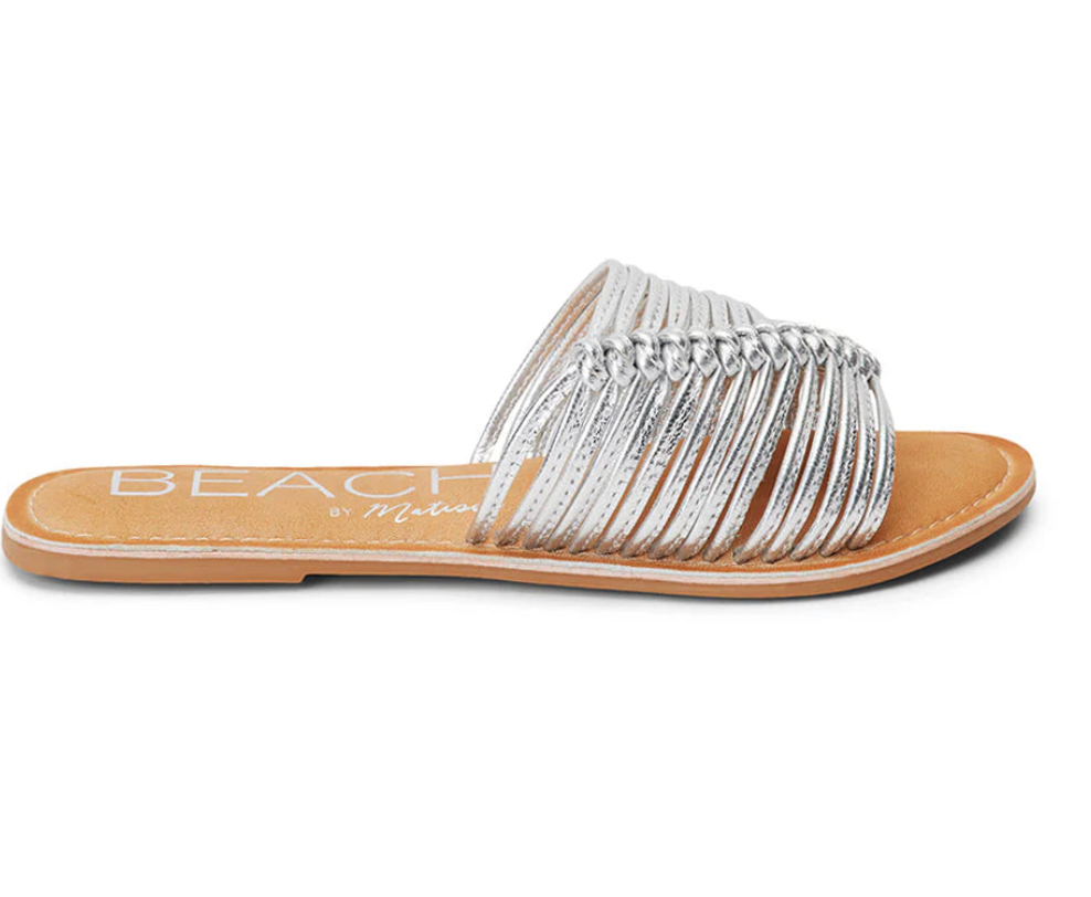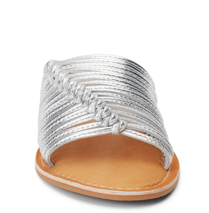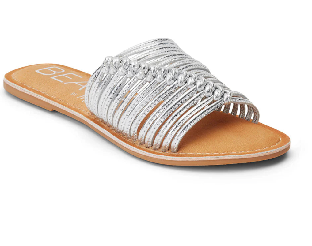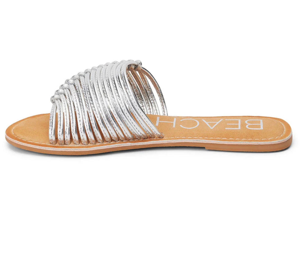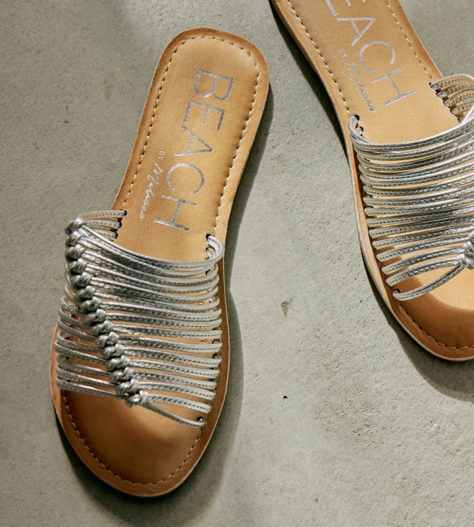 Introducing the Baxter in Silver, a quirky multi-strap slide sandal with unique woven detail. Slip into style and stand out from the crowd with this fun and playful shoe. Perfect for adding a touch of personality to any outfit. (Go ahead, show off those toes!)