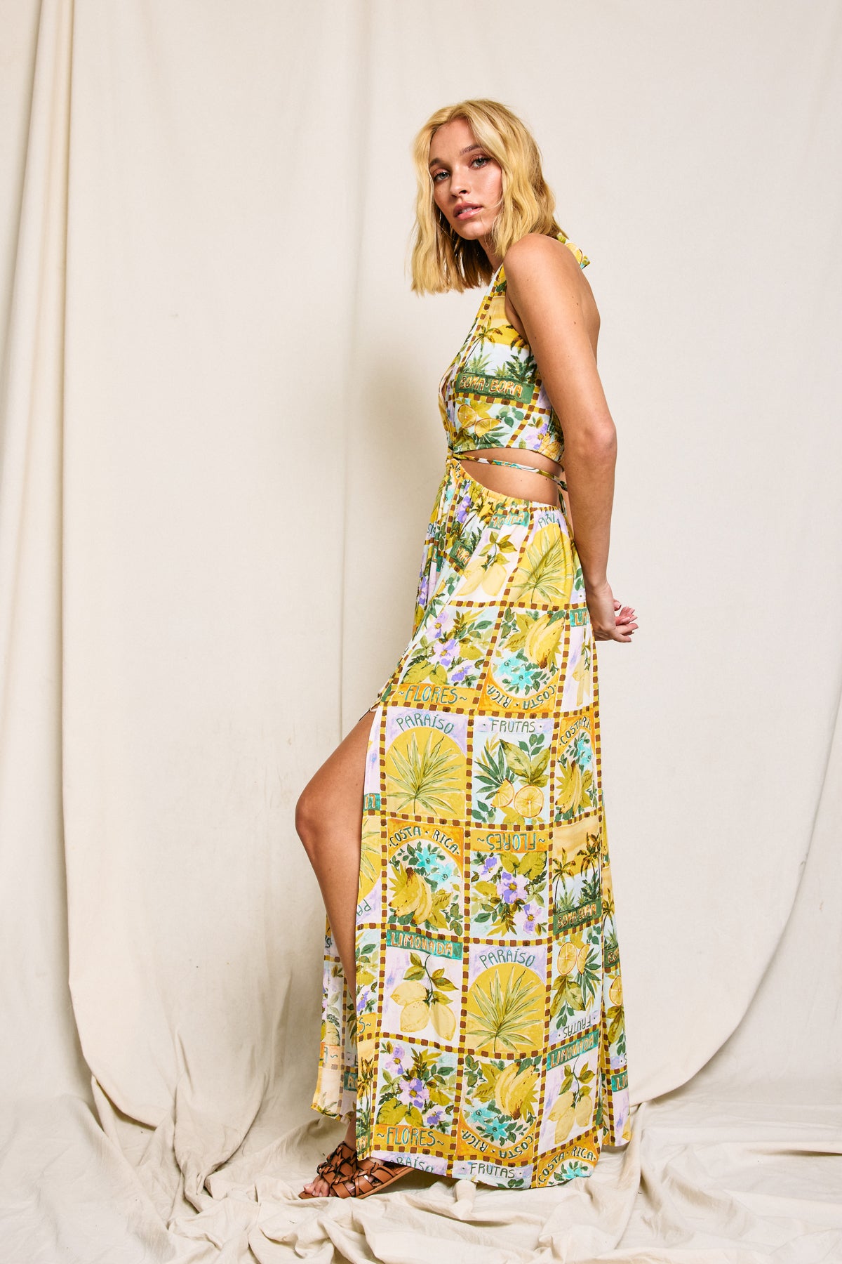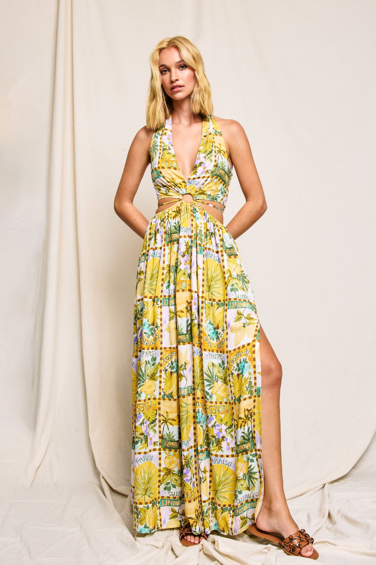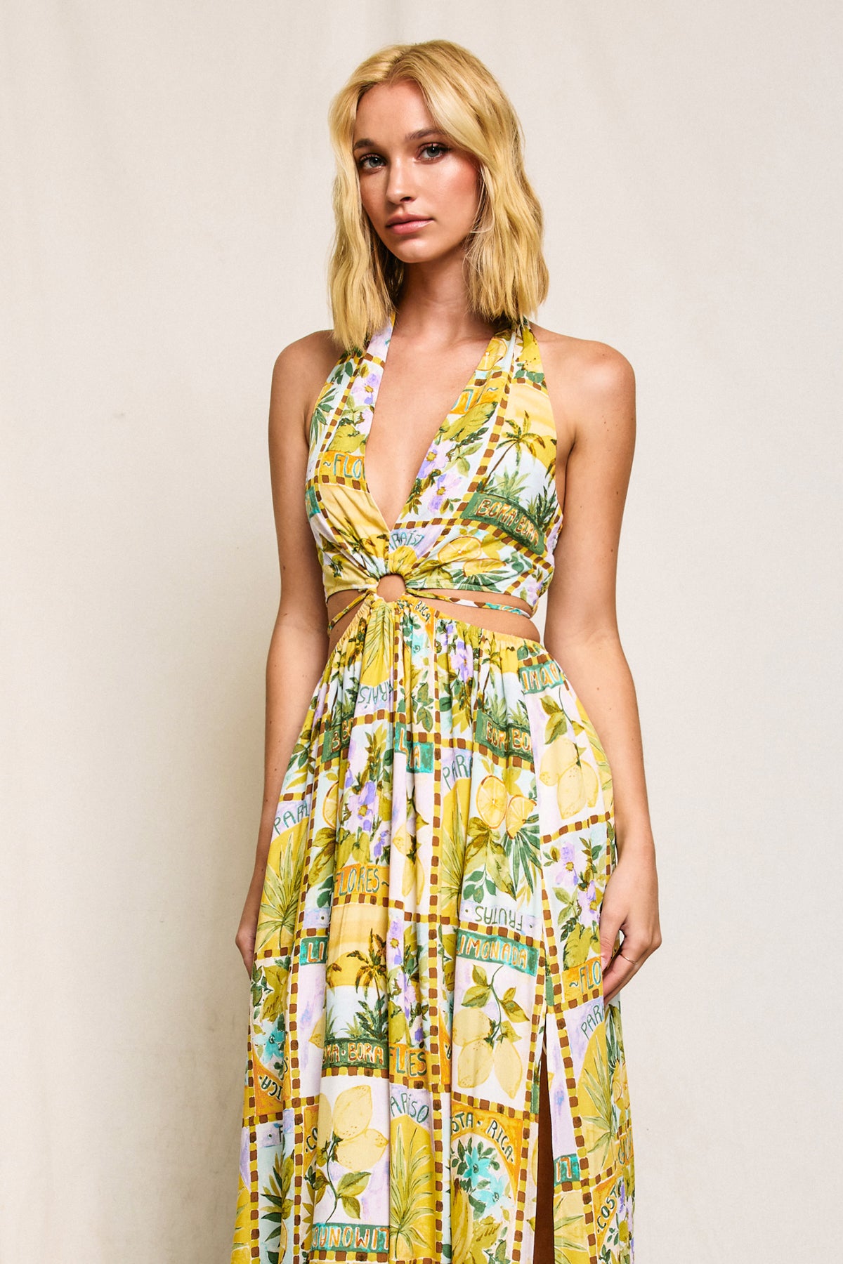 Isla Palma Halter Neck O Ring Cutout Maxi Dress - Yellow Tropical Print