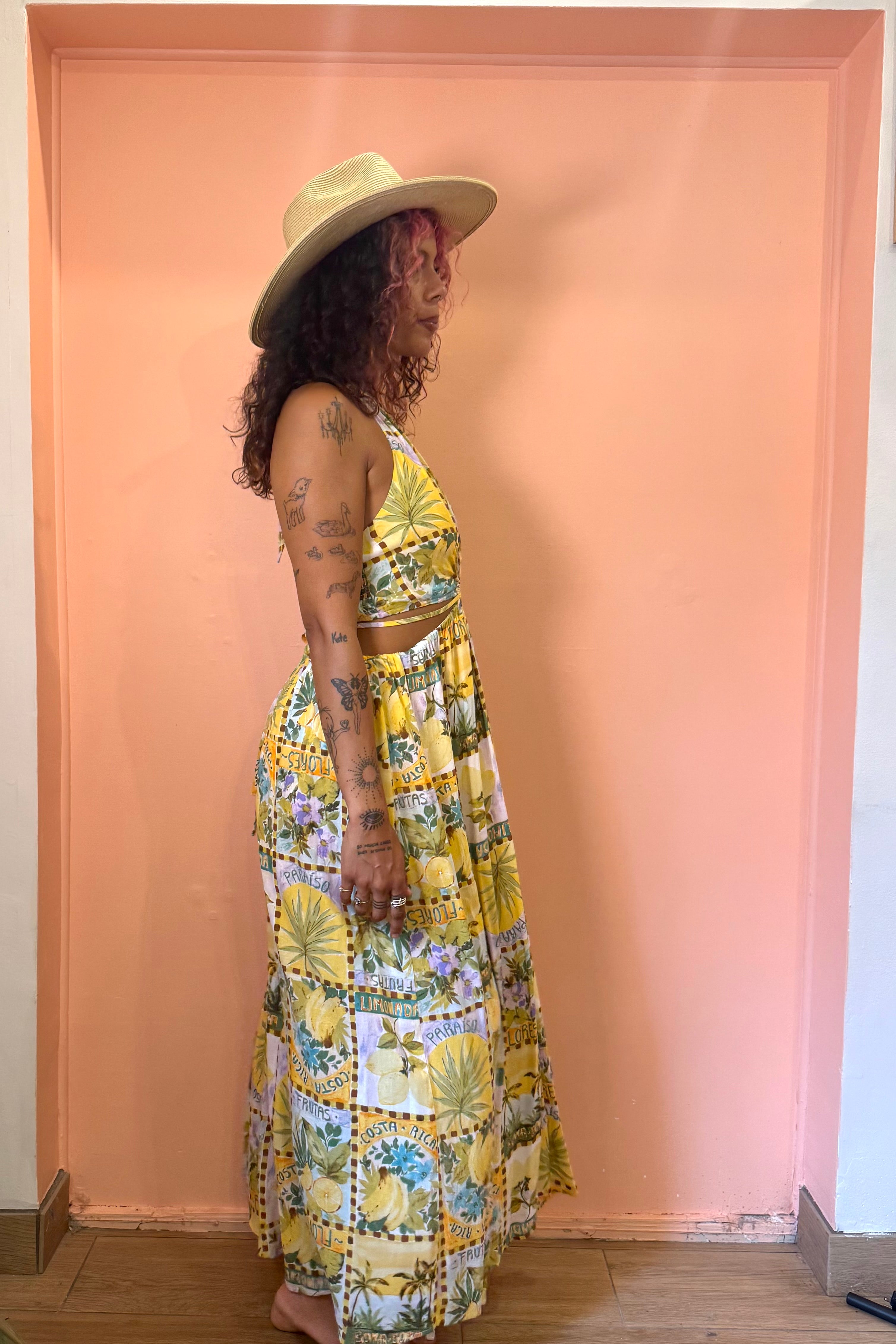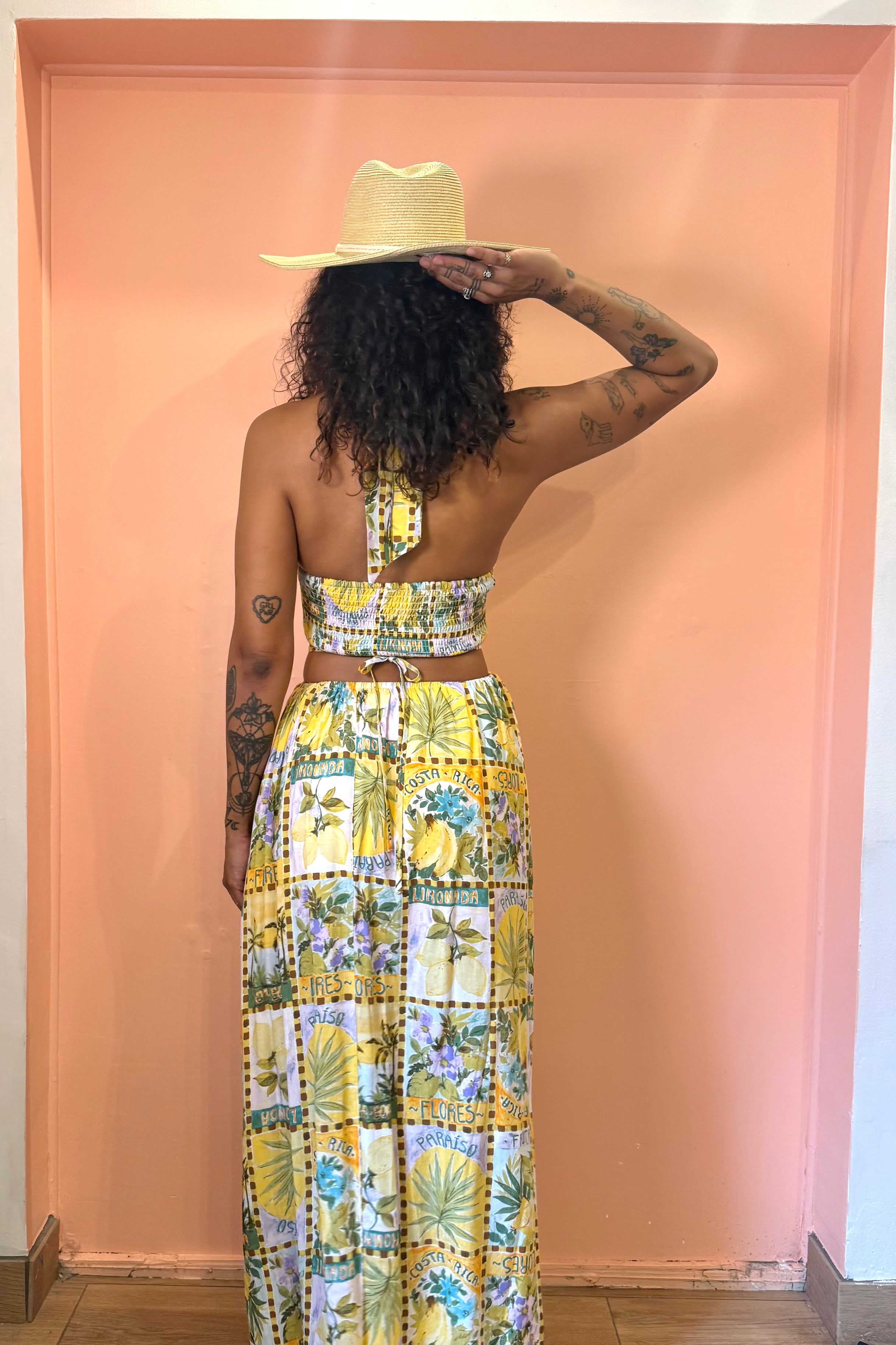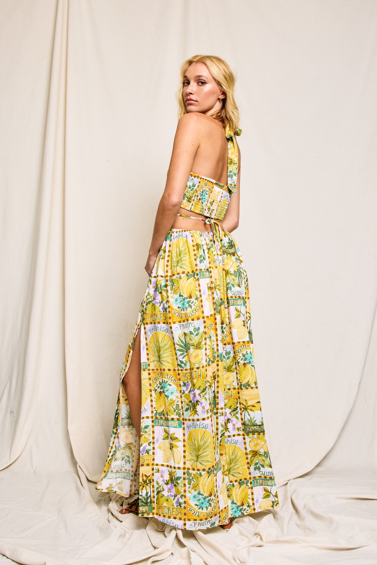 Isla Palma Halter Neck O Ring Cutout Maxi Dress - Yellow Tropical Print