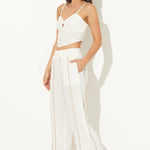 These white Linen Pants features a wide leg design and a comfortable elastic waist. The tan piping adds a touch of sophistication, making this pant perfect for any occasion, from summer vacations to casual outings. Pair it with our matching linen crop top for a complete, effortless look.
