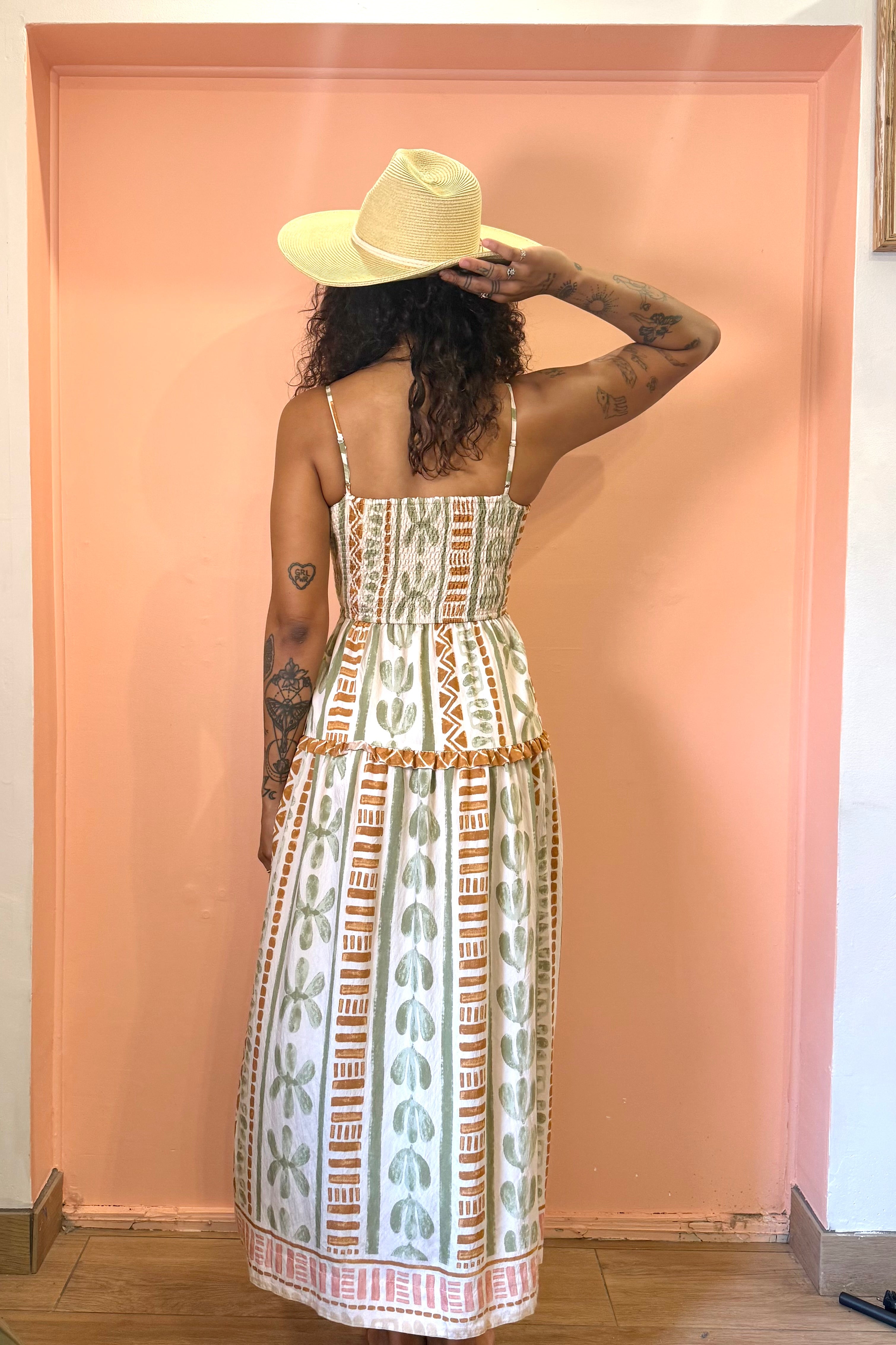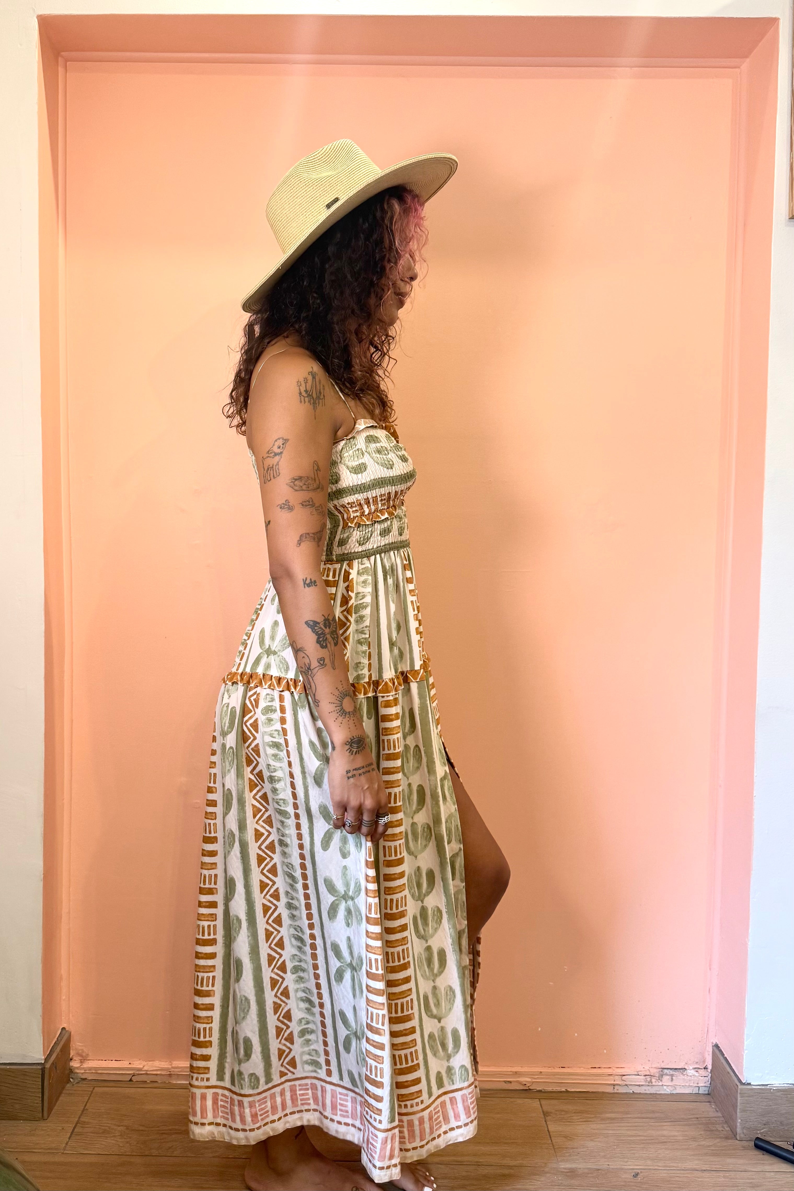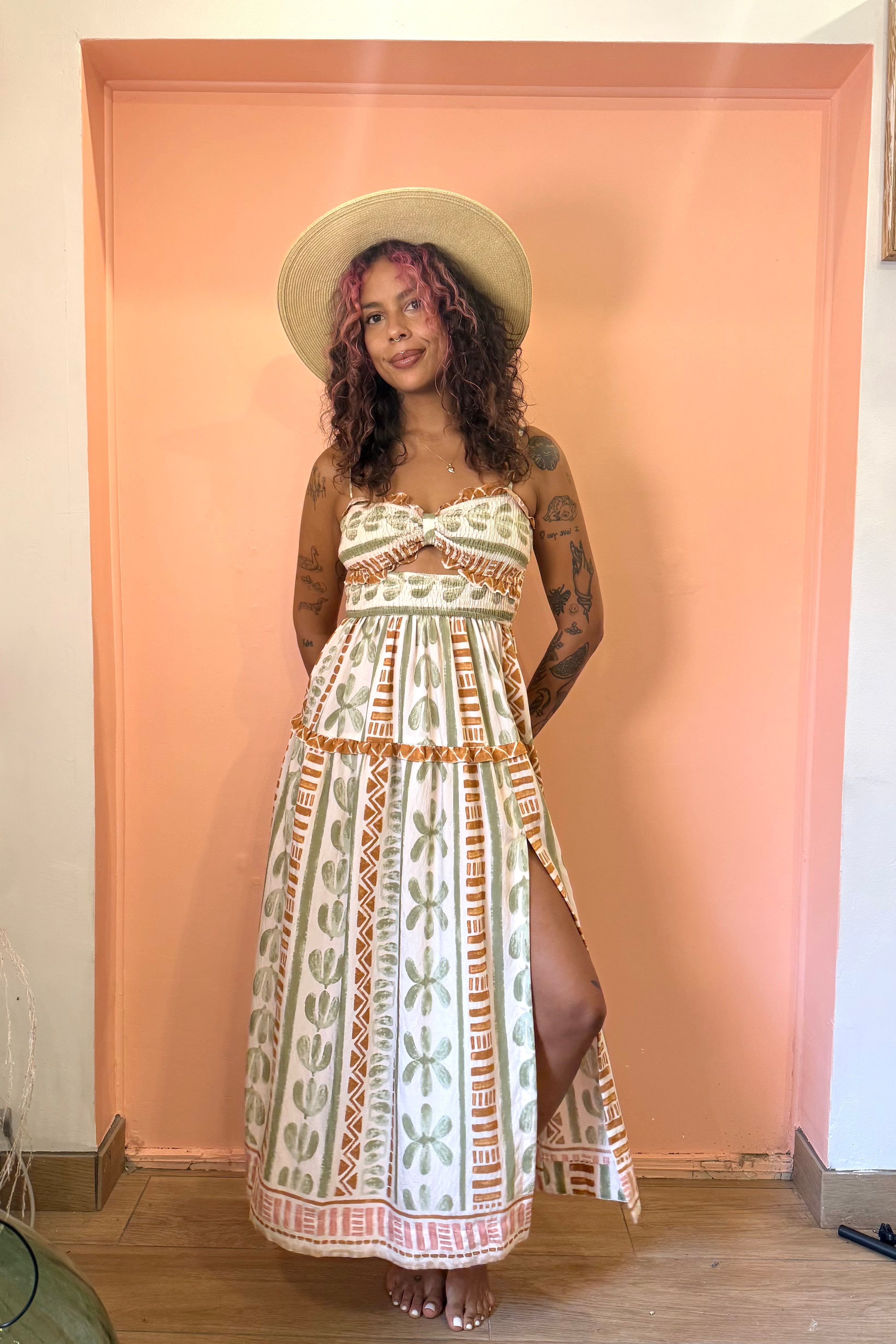 The Bahamas Cutout Smocked Maxi Dress- Green Brown Border Print
