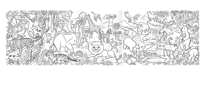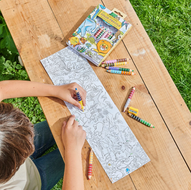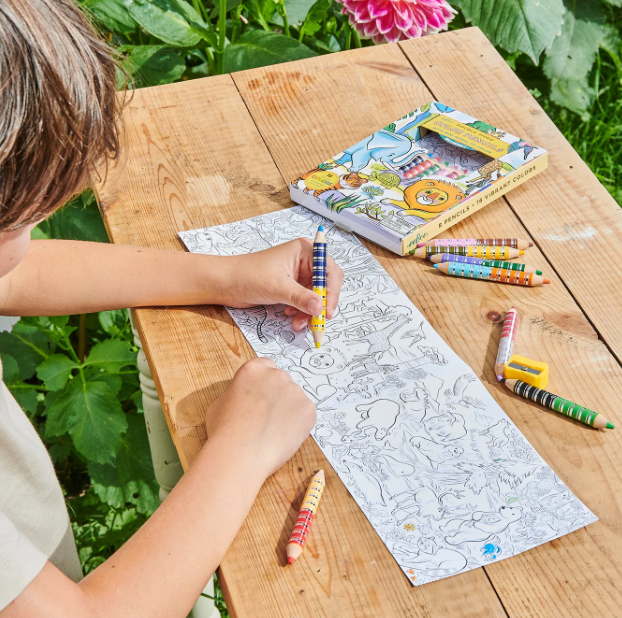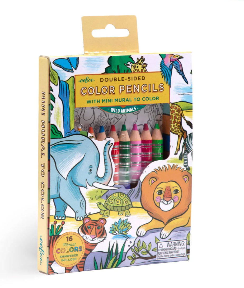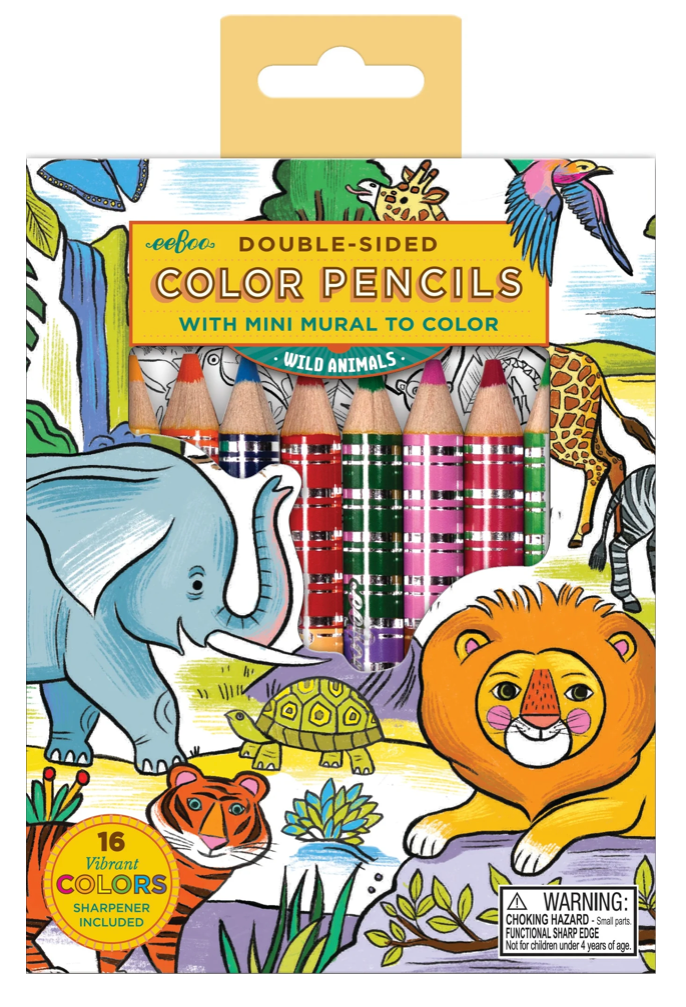 High quality color pencils with 16 colors with a long and detailed fold-out mural to color, filled with wild animals.