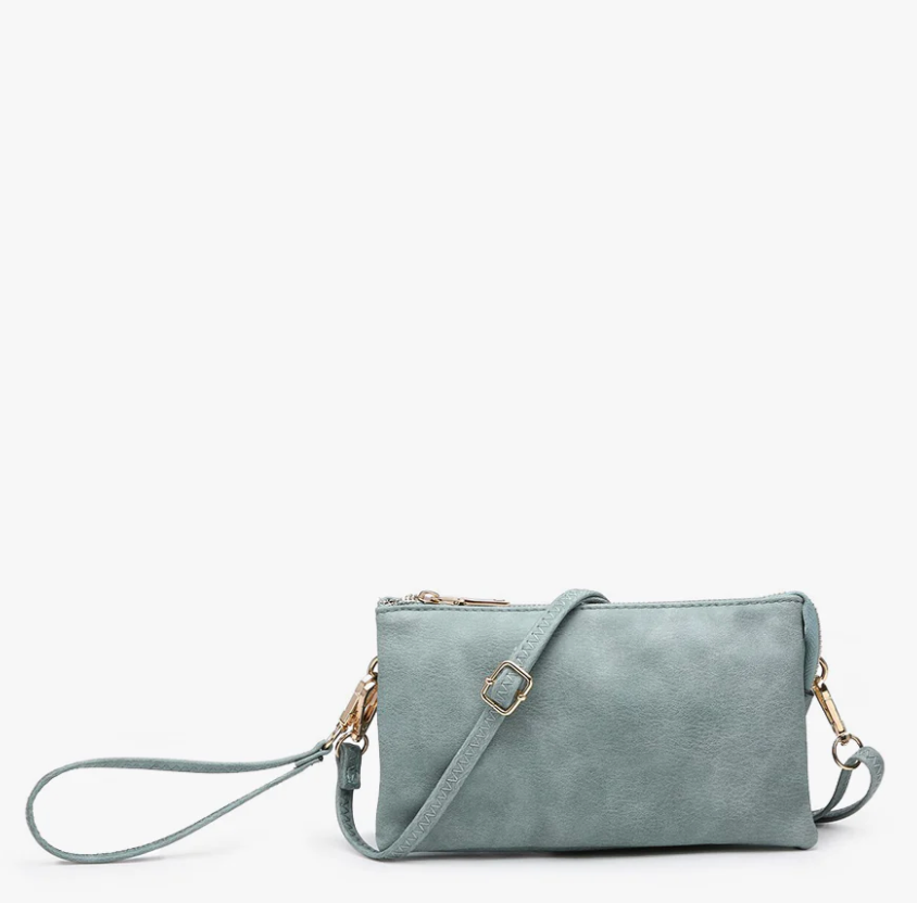 Discover the Riley Crossbody, a beloved favorite and a top seller in our eco-friendly handbag collection. This versatile vegan leather crossbody/clutch is designed for both functionality and style. It features two major compartments, a secure middle zipper pocket, and a top zipper closure to keep your essentials organized. Inside, find two slip pockets and six cardholders, providing ample space for all your belongings. Whether worn as a crossbody for hands-free convenience or carried as a clutch for a sleek look, the Riley adapts to your style needs. Crafted from premium vegan leather, it offers both luxury and durability. The bag comes with a detachable wristlet strap and an adjustable shoulder strap, allowing for versatile carrying options. Dimensions: 9"L x 1.5"D x 5"H — the perfect balance between practicality and elegance. Elevate your accessory game with the Riley Bag, your go-to choice for any occasion.