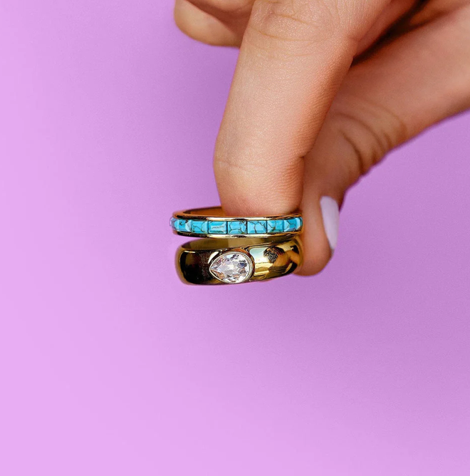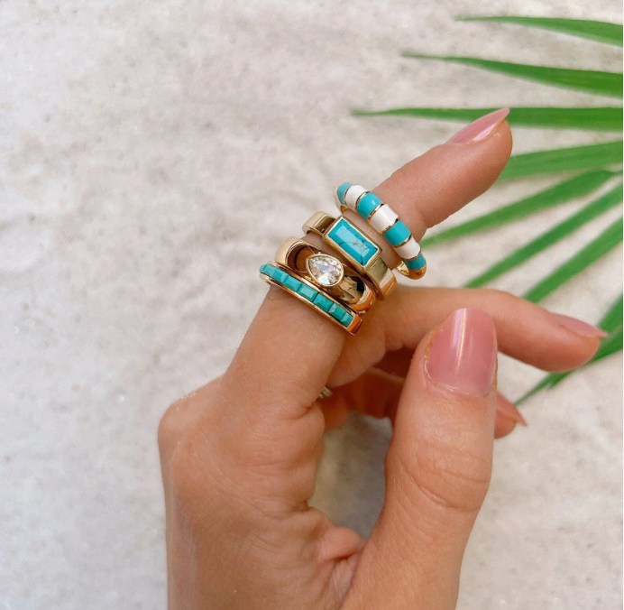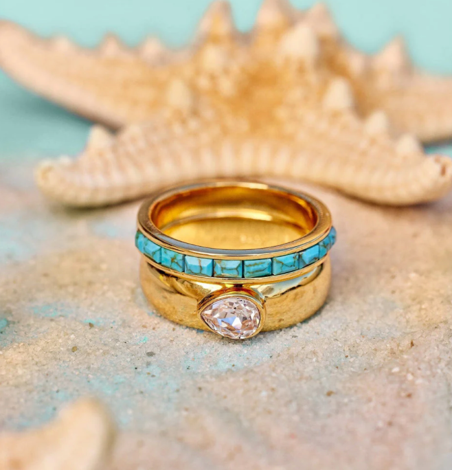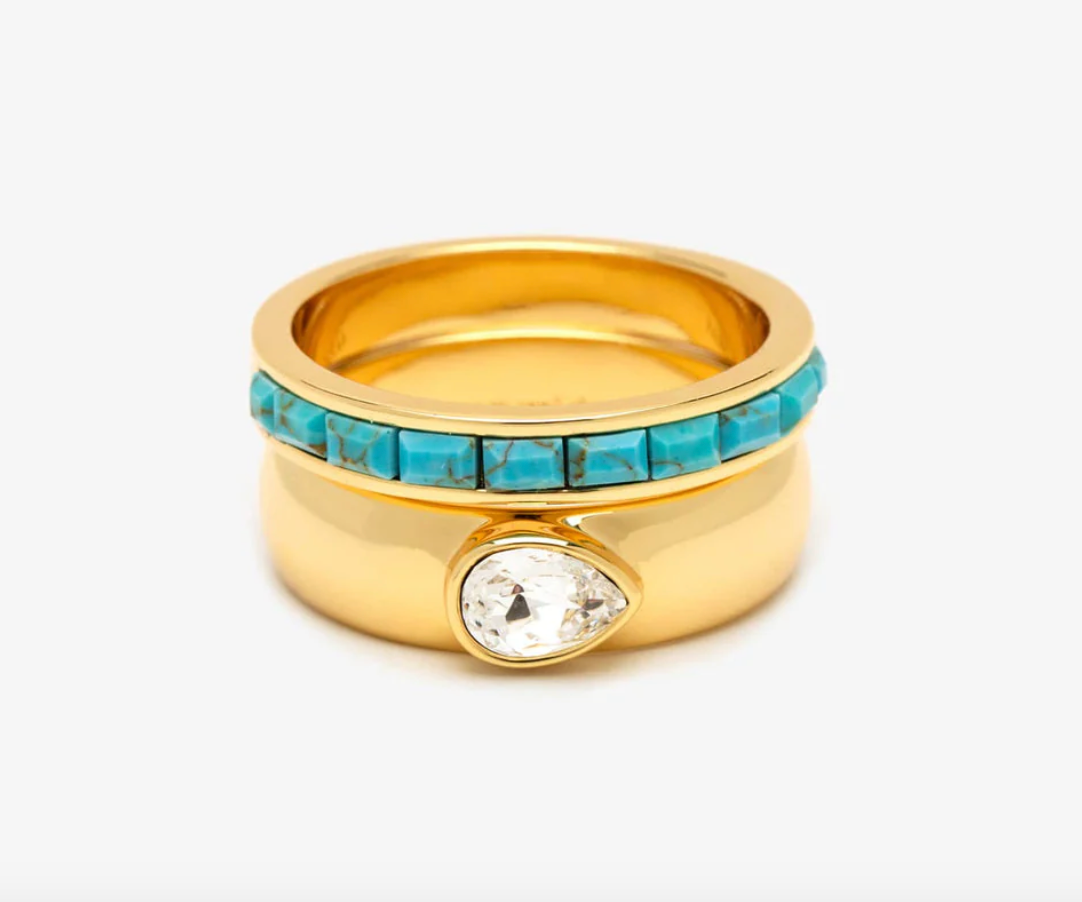 Spring Break approved ring stack: check! This two-piece set beautifully combines coastal-inspired blue and gold tones with a bezel-set glass center stone and genuine turquoise tile bead inlay.