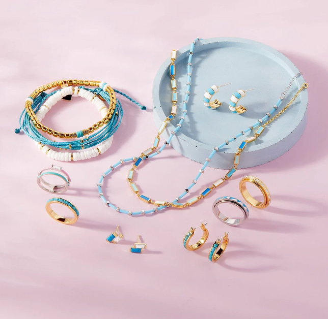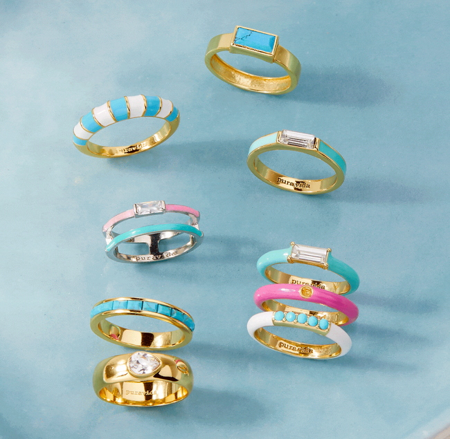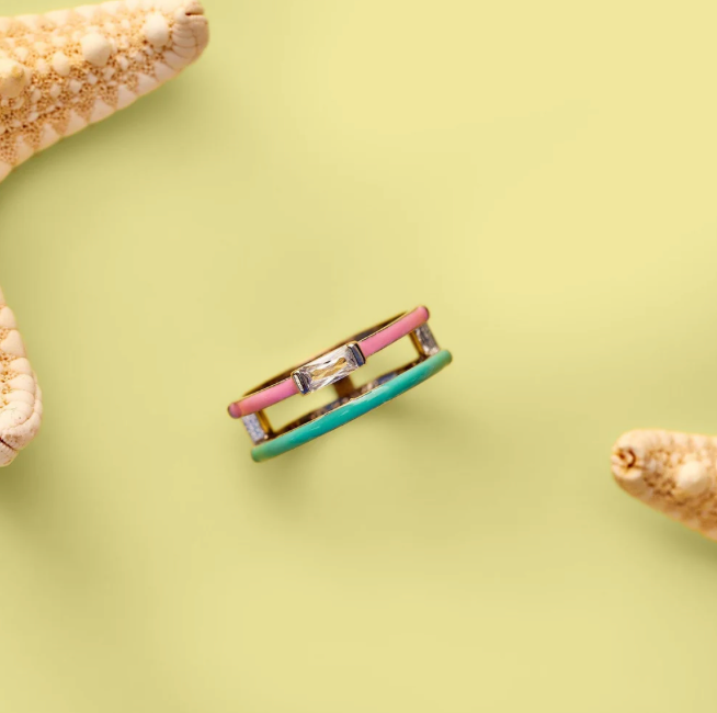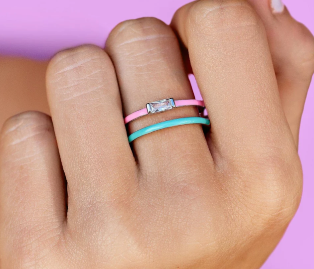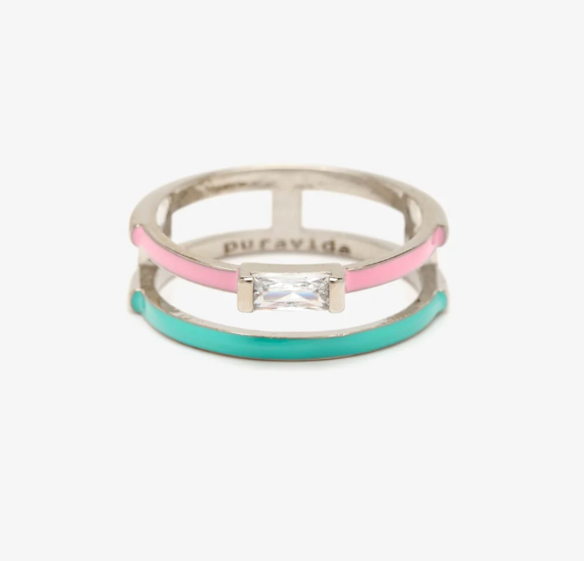 Vibrant contrast creates a unique stack dynamic in one single piece with the Leilani Layered Ring. This ring has two bands that meet at the back, both surrounded by glossy, pastel enamel. The top band features a Baguette clear glass stone in a bezel setting.