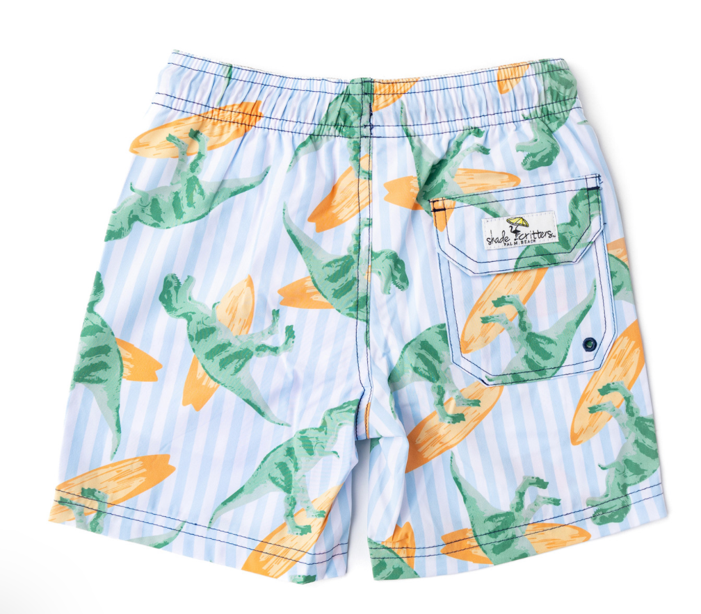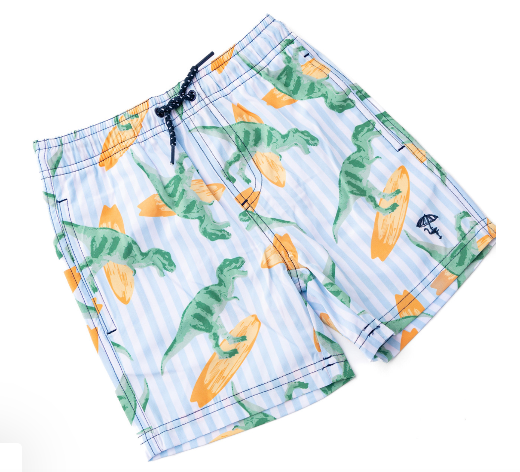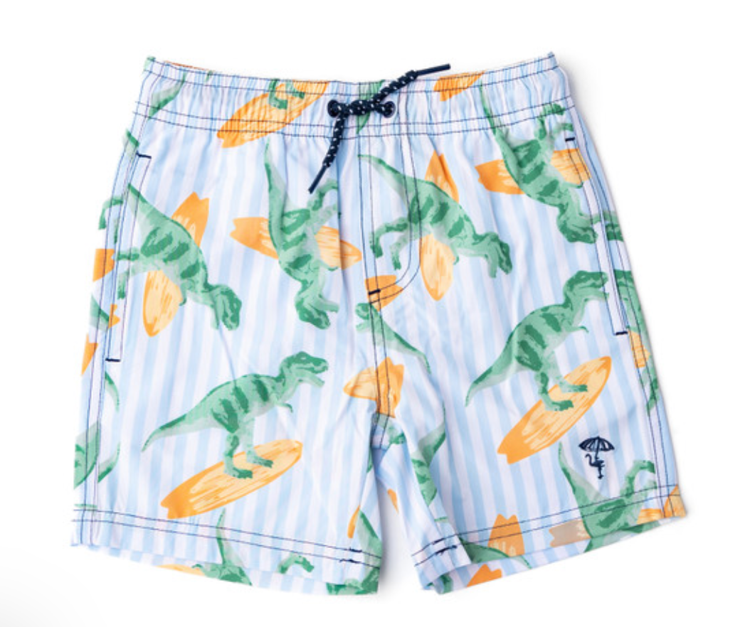 He is ready to roar in the Hang Ten Dino Boys 4-Way Stretch Swim Trunks! Featuring a fun and playful dinosaur print, these swim trunks are designed to keep up with all his summer adventures. Built for comfort, flexibility, and sun protection, these trunks are perfect for active boys who love to swim, play, and explore. Designed in the USA, boys will be boys with the striped dino print that will be the only suit they want to wear.